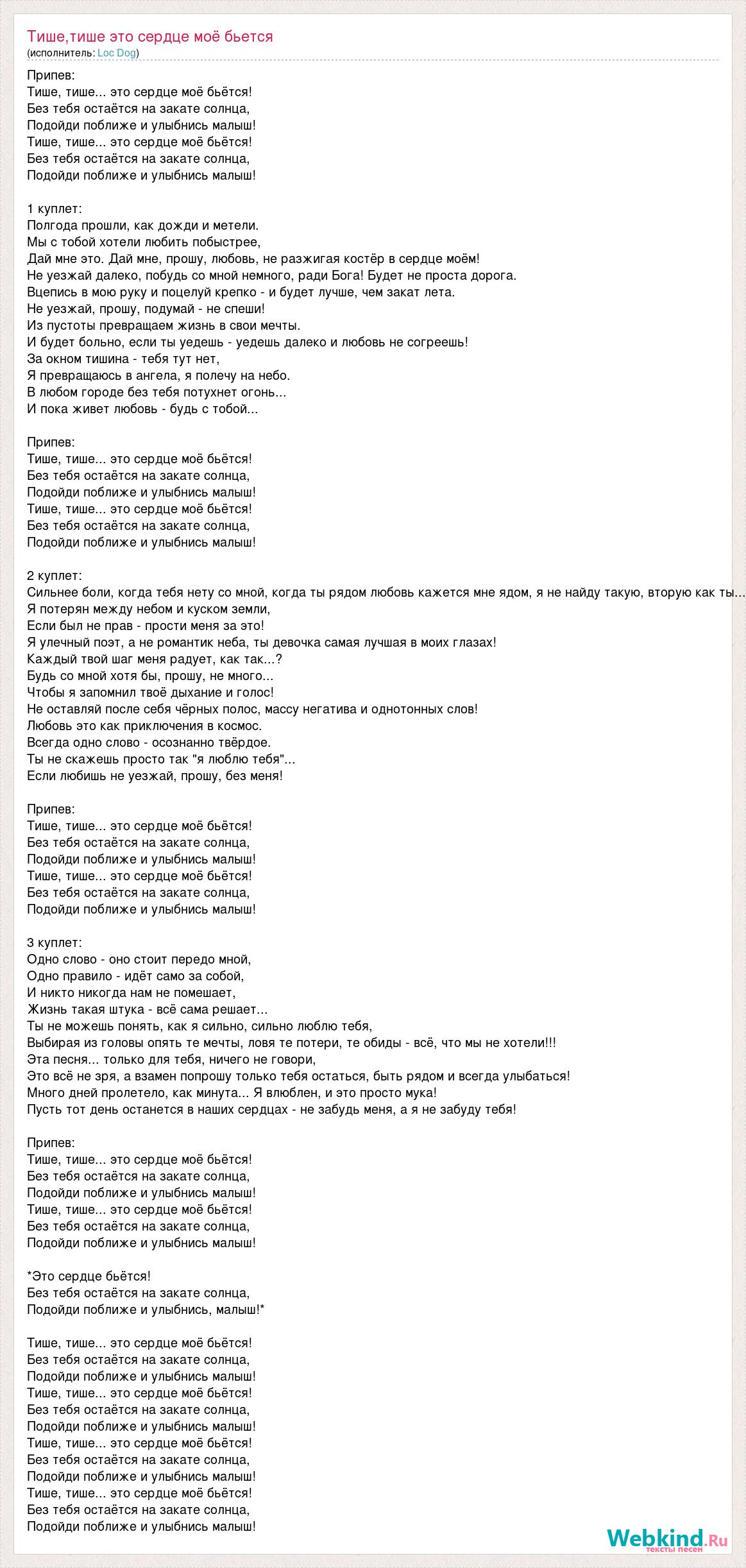 Припев: Тише, тише... это сердце моё бьётся! Без тебя остаётся на закате солнца, Подойди поближе и улыбнись малыш! Тише, тише... это сердце моё бьётся! Без тебя остаётся на закате солнца, Подойди поближе и улыбнись малыш! 1 куплет: Полгода прошли, как дожди и метели. Мы с тобой хотели любить побыстрее, Дай мне это. Дай мне, прошу, любовь, не разжигая костёр в сердце моём! Не уезжай далеко, побудь со мной немного, ради Бога! Будет не проста дорога. Вцепись в мою руку и поцелуй крепко - и будет лучше, чем закат лета. Не уезжай, прошу, подумай - не спеши! Из пустоты превращаем жизнь в свои мечты. И будет больно, если ты уедешь - уедешь далеко и любовь не согреешь! За окном тишина - тебя тут нет, Я превращаюсь в ангела, я полечу на небо. В любом городе без тебя потухнет огонь... И пока живет любовь - будь с тобой... Припев: Тише, тише... это сердце моё бьётся! Без тебя остаётся на закате солнца, Подойди поближе и улыбнись малыш! Тише, тише... это сердце моё бьётся! Без тебя остаётся на закате солнца, Подойди поближе и улыбнись малыш! 2 куплет: Сильнее боли, когда тебя нету со мной, когда ты рядом любовь кажется мне ядом, я не найду такую, вторую как ты... Я потерян между небом и куском земли, Если был не прав - прости меня за это! Я улечный поэт, а не романтик неба, ты девочка самая лучшая в моих глазах! Каждый твой шаг меня радует, как так...? Будь со мной хотя бы, прошу, не много... Чтобы я запомнил твоё дыхание и голос! Не оставляй после себя чёрных полос, массу негатива и однотонных слов! Любовь это как приключения в космос. Всегда одно слово - осознанно твёрдое. Ты не скажешь просто так "я люблю тебя"... Если любишь не уезжай, прошу, без меня! Припев: Тише, тише... это сердце моё бьётся! Без тебя остаётся на закате солнца, Подойди поближе и улыбнись малыш! Тише, тише... это сердце моё бьётся! Без тебя остаётся на закате солнца, Подойди поближе и улыбнись малыш! 3 куплет: Одно слово - оно стоит передо мной, Одно правило - идёт само за собой, И никто никогда нам не помешает, Жизнь такая штука - всё сама решает... Ты не можешь понять, как я сильно, сильно люблю тебя, Выбирая из головы опять те мечты, ловя те потери, те обиды - всё, что мы не хотели!!! Эта песня... только для тебя, ничего не говори, Это всё не зря, а взамен попрошу только тебя остаться, быть рядом и всегда улыбаться! Много дней пролетело, как минута... Я влюблен, и это просто мука! Пусть тот день останется в наших сердцах - не забудь меня, а я не забуду тебя! Припев: Тише, тише... это сердце моё бьётся! Без тебя остаётся на закате солнца, Подойди поближе и улыбнись малыш! Тише, тише... это сердце моё бьётся! Без тебя остаётся на закате солнца, Подойди поближе и улыбнись малыш! *Это сердце бьётся! Без тебя остаётся на закате солнца, Подойди поближе и улыбнись, малыш!* Тише, тише... это сердце моё бьётся! Без тебя остаётся на закате солнца, Подойди поближе и улыбнись малыш! Тише, тише... это сердце моё бьётся! Без тебя остаётся на закате солнца, Подойди поближе и улыбнись малыш! Тише, тише... это сердце моё бьётся! Без тебя остаётся на закате солнца, Подойди поближе и улыбнись малыш! Тише, тише... это сердце моё бьётся! Без тебя остаётся на закате солнца, Подойди поближе и улыбнись малыш!