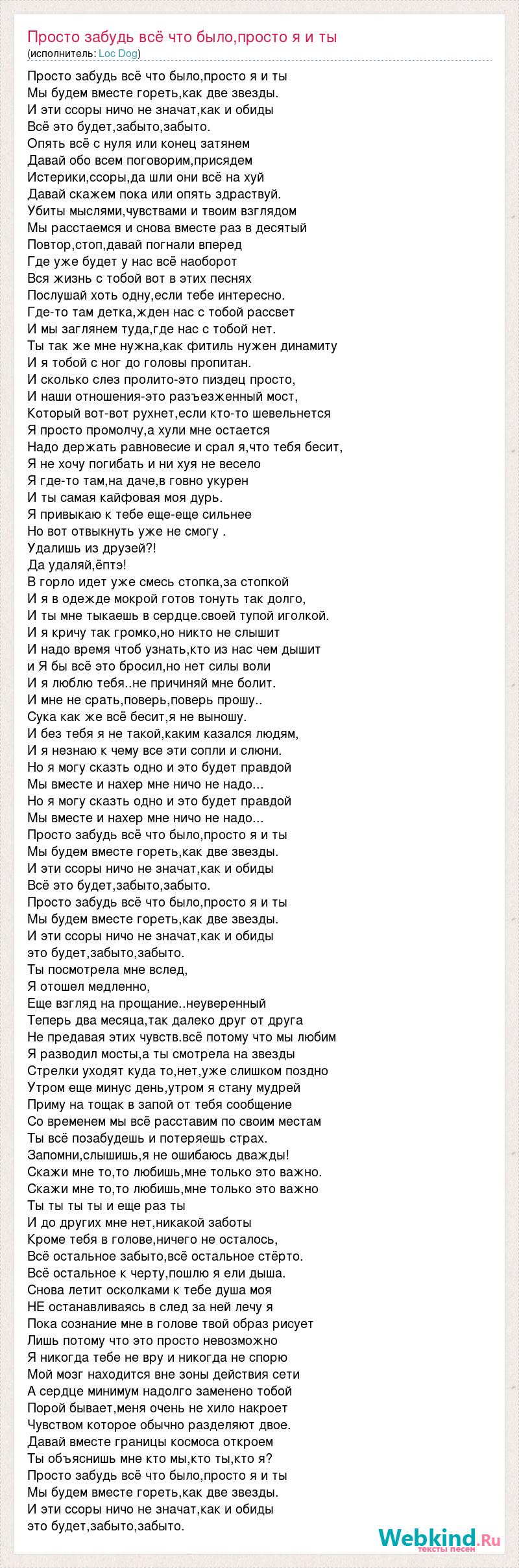Просто забудь всё что было,просто я и ты Мы будем вместе гореть,как две звезды. И эти ссоры ничо не значат,как и обиды Всё это будет,забыто,забыто. Опять всё с нуля или конец затянем Давай обо всем поговорим,присядем Истерики,ссоры,да шли они всё на хуй Давай скажем пока или опять здраствуй. Убиты мыслями,чувствами и твоим взглядом Мы расстаемся и снова вместе раз в десятый Повтор,стоп,давай погнали вперед Где уже будет у нас всё наоборот Вся жизнь с тобой вот в этих песнях Послушай хоть одну,если тебе интересно. Где-то там детка,жден нас с тобой рассвет И мы заглянем туда,где нас с тобой нет. Ты так же мне нужна,как фитиль нужен динамиту И я тобой с ног до головы пропитан. И сколько слез пролито-это пиздец просто, И наши отношения-это разъезженный мост, Который вот-вот рухнет,если кто-то шевельнется Я просто промолчу,а хули мне остается Надо держать равновесие и срал я,что тебя бесит, Я не хочу погибать и ни хуя не весело Я где-то там,на даче,в говно укурен И ты самая кайфовая моя дурь. Я привыкаю к тебе еще-еще сильнее Но вот отвыкнуть уже не смогу . Удалишь из друзей?! Да удаляй,ёптэ! В горло идет уже смесь стопка,за стопкой И я в одежде мокрой готов тонуть так долго, И ты мне тыкаешь в сердце.своей тупой иголкой. И я кричу так громко,но никто не слышит И надо время чтоб узнать,кто из нас чем дышит и Я бы всё это бросил,но нет силы воли И я люблю тебя..не причиняй мне болит. И мне не срать,поверь,поверь прошу.. Сука как же всё бесит,я не выношу. И без тебя я не такой,каким казался людям, И я незнаю к чему все эти сопли и слюни. Но я могу сказть одно и это будет правдой Мы вместе и нахер мне ничо не надо... Но я могу сказть одно и это будет правдой Мы вместе и нахер мне ничо не надо... Просто забудь всё что было,просто я и ты Мы будем вместе гореть,как две звезды. И эти ссоры ничо не значат,как и обиды Всё это будет,забыто,забыто. Просто забудь всё что было,просто я и ты Мы будем вместе гореть,как две звезды. И эти ссоры ничо не значат,как и обиды это будет,забыто,забыто. Ты посмотрела мне вслед, Я отошел медленно, Еще взгляд на прощание..неуверенный Теперь два месяца,так далеко друг от друга Не предавая этих чувств.всё потому что мы любим Я разводил мосты,а ты смотрела на звезды Стрелки уходят куда то,нет,уже слишком поздно Утром еще минус день,утром я стану мудрей Приму на тощак в запой от тебя сообщение Со временем мы всё расставим по своим местам Ты всё позабудешь и потеряешь страх. Запомни,слышишь,я не ошибаюсь дважды! Скажи мне то,то любишь,мне только это важно. Скажи мне то,то любишь,мне только это важно Ты ты ты ты и еще раз ты И до других мне нет,никакой заботы Кроме тебя в голове,ничего не осталось, Всё остальное забыто,всё остальное стёрто. Всё остальное к черту,пошлю я ели дыша. Снова летит осколками к тебе душа моя НЕ останавливаясь в след за ней лечу я Пока сознание мне в голове твой образ рисует Лишь потому что это просто невозможно Я никогда тебе не вру и никогда не спорю Мой мозг находится вне зоны действия сети А сердце минимум надолго заменено тобой Порой бывает,меня очень не хило накроет Чувством которое обычно разделяют двое. Давай вместе границы космоса откроем Ты объяснишь мне кто мы,кто ты,кто я? Просто забудь всё что было,просто я и ты Мы будем вместе гореть,как две звезды. И эти ссоры ничо не значат,как и обиды это будет,забыто,забыто.