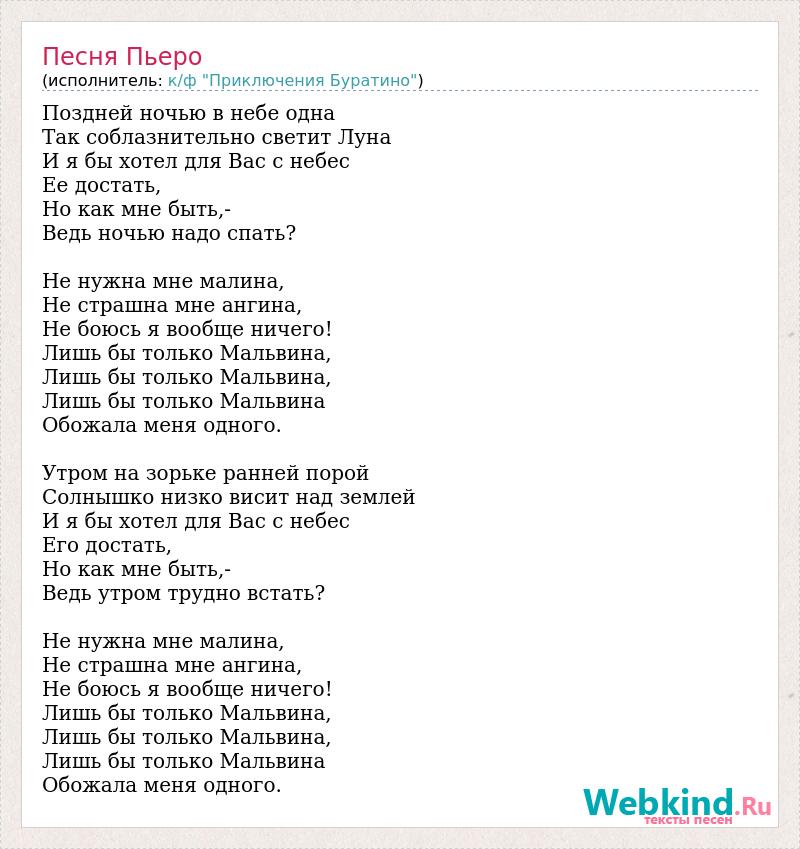 Поздней ночью в небе одна Так соблазнительно светит Луна И я бы хотел для Вас с небес Ее достать, Но как мне быть,- Ведь ночью надо спать? Не нужна мне малина, Не страшна мне ангина, Не боюсь я вообще ничего! Лишь бы только Мальвина, Лишь бы только Мальвина, Лишь бы только Мальвина Обожала меня одного. Утром на зорьке ранней порой Солнышко низко висит над землей И я бы хотел для Вас с небес Его достать, Но как мне быть,- Ведь утром трудно встать? Не нужна мне малина, Не страшна мне ангина, Не боюсь я вообще ничего! Лишь бы только Мальвина, Лишь бы только Мальвина, Лишь бы только Мальвина Обожала меня одного.