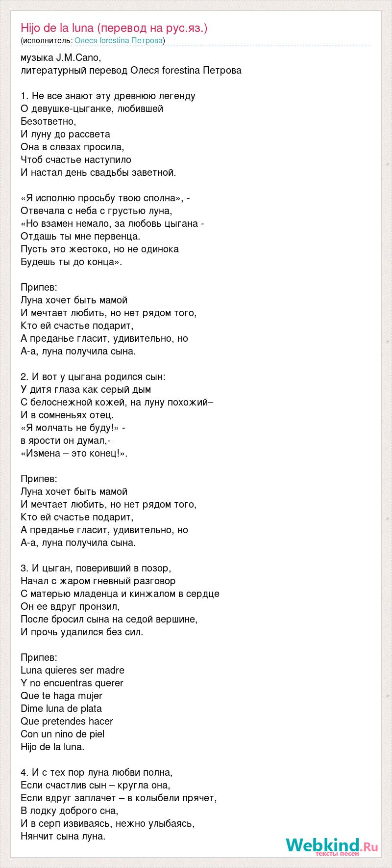 музыка J.M.Cano, литературный перевод Олеся forestina Петрова 1. Не все знают эту древнюю легенду О девушке-цыганке, любившей Безответно, И луну до рассвета Она в слезах просила, Чтоб счастье наступило И настал день свадьбы заветной. «Я исполню просьбу твою сполна», - Отвечала с неба с грустью луна, «Но взамен немало, за любовь цыгана - Отдашь ты мне первенца. Пусть это жестоко, но не одинока Будешь ты до конца». Припев: Луна хочет быть мамой И мечтает любить, но нет рядом того, Кто ей счастье подарит, А преданье гласит, удивительно, но А-а, луна получила сына. 2. И вот у цыгана родился сын: У дитя глаза как серый дым С белоснежной кожей, на луну похожий– И в сомненьях отец. «Я молчать не буду!» - в ярости он думал,- «Измена – это конец!». Припев: Луна хочет быть мамой И мечтает любить, но нет рядом того, Кто ей счастье подарит, А преданье гласит, удивительно, но А-а, луна получила сына. 3. И цыган, поверивший в позор, Начал с жаром гневный разговор С матерью младенца и кинжалом в сердце Он ее вдруг пронзил, После бросил сына на седой вершине, И прочь удалился без сил. Припев: Luna quieres ser madre Y no encuentras querer Que te haga mujer Dime luna de plata Que pretendes hacer Con un nino de piel Hijo de la luna. 4. И с тех пор луна любви полна, Если счастлив сын – кругла она, Если вдруг заплачет – в колыбели прячет, В лодку доброго сна, И в серп извиваясь, нежно улыбаясь, Нянчит сына луна.