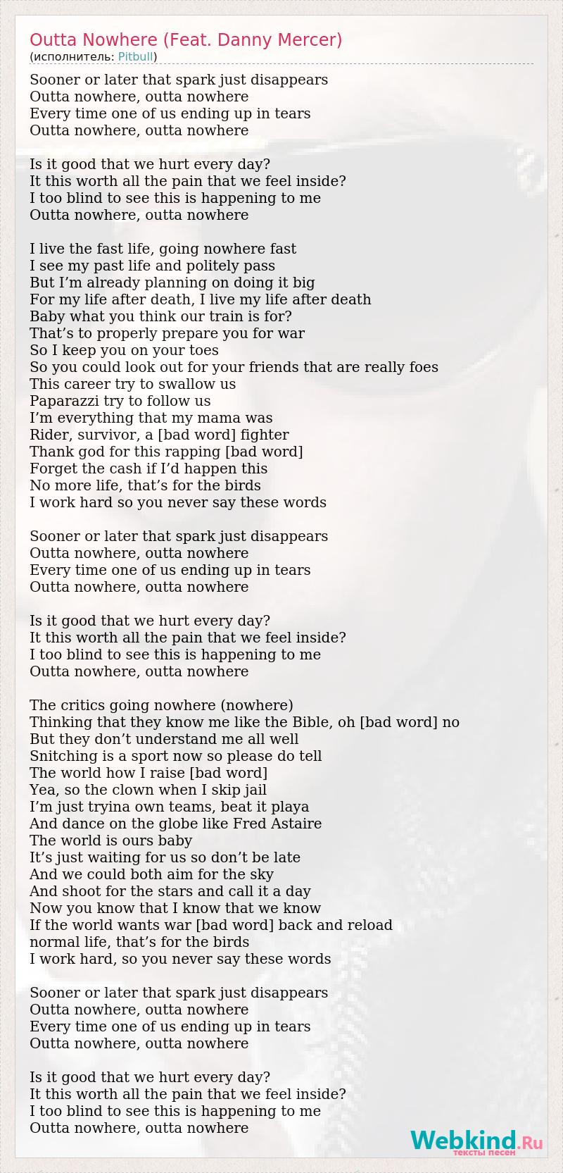 Sooner or later that spark just disappears Outta nowhere, outta nowhere Every time one of us ending up in tears Outta nowhere, outta nowhere Is it good that we hurt every day? It this worth all the pain that we feel inside? I too blind to see this is happening to me Outta nowhere, outta nowhere I live the fast life, going nowhere fast I see my past life and politely pass But I’m already planning on doing it big For my life after death, I live my life after death Baby what you think our train is for? That’s to properly prepare you for war So I keep you on your toes So you could look out for your friends that are really foes This career try to swallow us Paparazzi try to follow us I’m everything that my mama was Rider, survivor, a [bad word] fighter Thank god for this rapping [bad word] Forget the cash if I’d happen this No more life, that’s for the birds I work hard so you never say these words Sooner or later that spark just disappears Outta nowhere, outta nowhere Every time one of us ending up in tears Outta nowhere, outta nowhere Is it good that we hurt every day? It this worth all the pain that we feel inside? I too blind to see this is happening to me Outta nowhere, outta nowhere The critics going nowhere (nowhere) Thinking that they know me like the Bible, oh [bad word] no But they don’t understand me all well Snitching is a sport now so please do tell The world how I raise [bad word] Yea, so the clown when I skip jail I’m just tryina own teams, beat it playa And dance on the globe like Fred Astaire The world is ours baby It’s just waiting for us so don’t be late And we could both aim for the sky And shoot for the stars and call it a day Now you know that I know that we know If the world wants war [bad word] back and reload normal life, that’s for the birds I work hard, so you never say these words Sooner or later that spark just disappears Outta nowhere, outta nowhere Every time one of us ending up in tears Outta nowhere, outta nowhere Is it good that we hurt every day? It this worth all the pain that we feel inside? I too blind to see this is happening to me Outta nowhere, outta nowhere