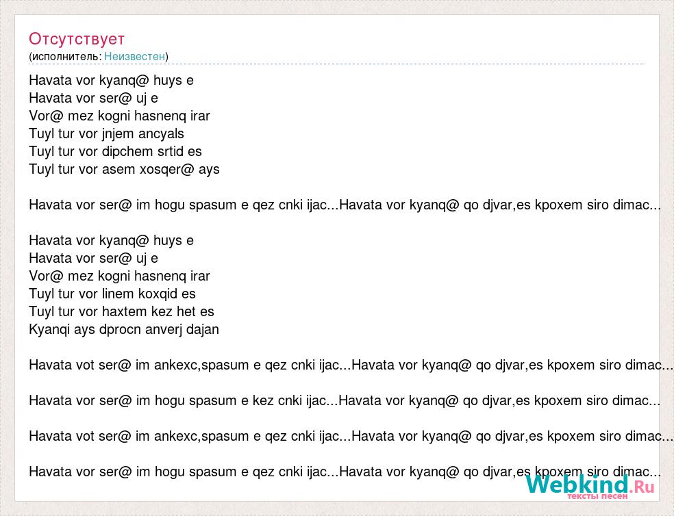 Havata vor kyanq@ huys e Havata vor ser@ uj e Vor@ mez kogni hasnenq irar Tuyl tur vor jnjem ancyals Tuyl tur vor dipchem srtid es Tuyl tur vor asem xosqer@ ays Havata vor ser@ im hogu spasum e qez cnki ijac...Havata vor kyanq@ qo djvar,es kpoxem siro dimac... Havata vor kyanq@ huys e Havata vor ser@ uj e Vor@ mez kogni hasnenq irar Tuyl tur vor linem koxqid es Tuyl tur vor haxtem kez het es Kyanqi ays dprocn anverj dajan Havata vot ser@ im ankexc,spasum e qez cnki ijac...Havata vor kyanq@ qo djvar,es kpoxem siro dimac... Havata vor ser@ im hogu spasum e kez cnki ijac...Havata vor kyanq@ qo djvar,es kpoxem siro dimac... Havata vot ser@ im ankexc,spasum e qez cnki ijac...Havata vor kyanq@ qo djvar,es kpoxem siro dimac... Havata vor ser@ im hogu spasum e qez cnki ijac...Havata vor kyanq@ qo djvar,es kpoxem siro dimac...