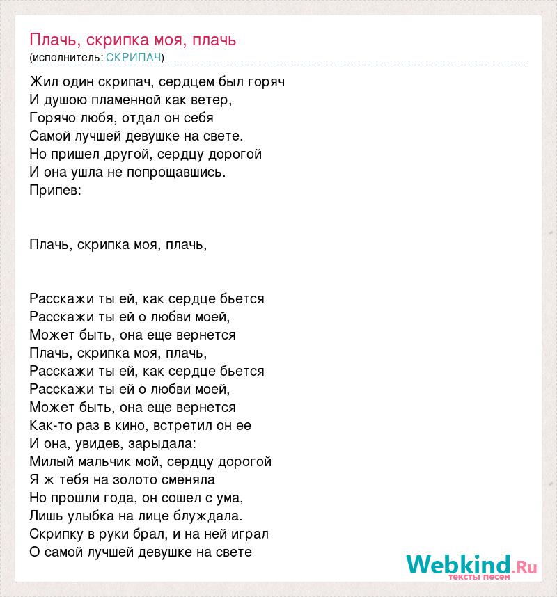Жил один скрипач, сердцем был горяч И душою пламенной как ветер, Горячо любя, отдал он себя Самой лучшей девушке на свете. Но пришел другой, сердцу дорогой И она ушла не попрощавшись. Припев: Плачь, скрипка моя, плачь, Расскажи ты ей, как сердце бьется Расскажи ты ей о любви моей, Может быть, она еще вернется Плачь, скрипка моя, плачь, Расскажи ты ей, как сердце бьется Расскажи ты ей о любви моей, Может быть, она еще вернется Как-то раз в кино, встретил он ее И она, увидев, зарыдала: Милый мальчик мой, сердцу дорогой Я ж тебя на золото сменяла Но прошли года, он сошел с ума, Лишь улыбка на лице блуждала. Скрипку в руки брал, и на ней играл О самой лучшей девушке на свете