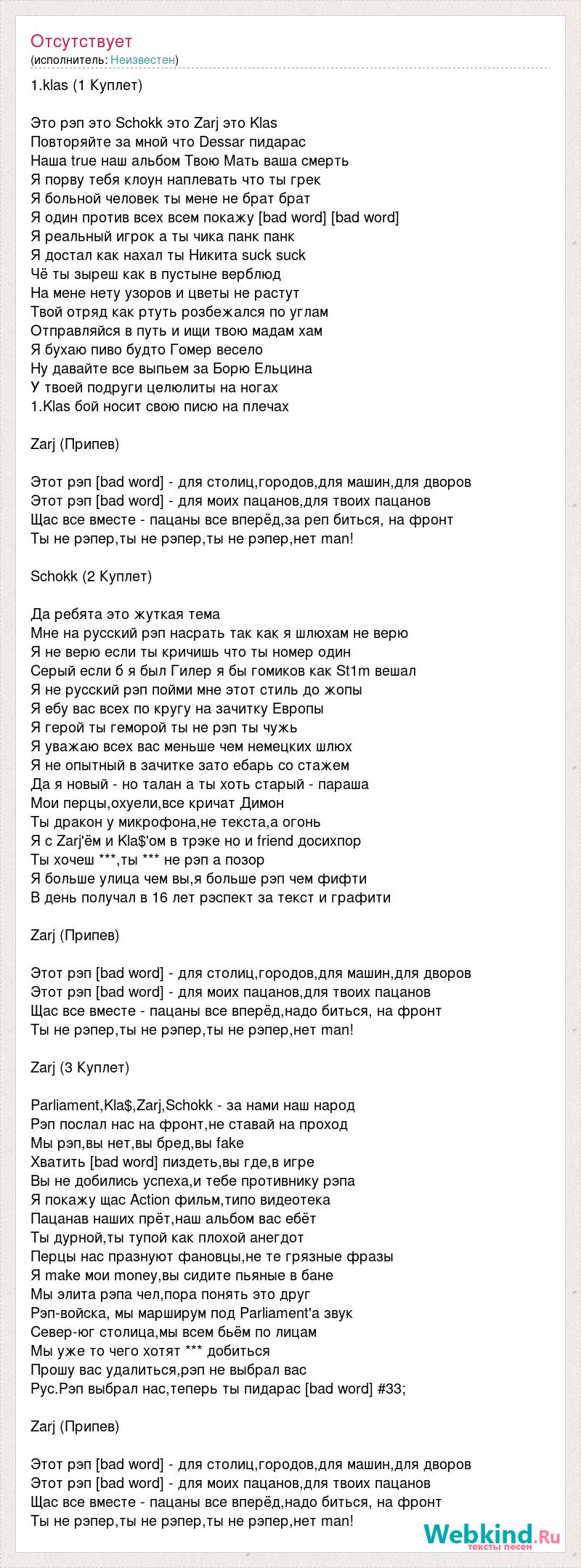1.klas (1 Куплет) Это рэп это Schokk это Zarj это Klas Повторяйте за мной что Dessar пидарас Наша true наш альбом Твою Мать ваша смерть Я порву тебя клоун наплевать что ты грек Я больной человек ты мене не брат брат Я один против всех всем покажу [bad word] [bad word] Я реальный игрок а ты чика панк панк Я достал как нахал ты Никита suck suck Чё ты зыреш как в пустыне верблюд На мене нету узоров и цветы не растут Твой отряд как ртуть розбежался по углам Отправляйся в путь и ищи твою мадам хам Я бухаю пиво будто Гомер весело Ну давайте все выпьем за Борю Ельцина У твоей подруги целюлиты на ногах 1.Klas бой носит свою писю на плечах Zarj (Припев) Этот рэп [bad word] - для столиц,городов,для машин,для дворов Этот рэп [bad word] - для моих пацанов,для твоих пацанов Щас все вместе - пацаны все вперёд,за реп биться, на фронт Ты не рэпер,ты не рэпер,ты не рэпер,нет man! Schokk (2 Куплет) Да ребята это жуткая тема Мне на русский рэп насрать так как я шлюхам не верю Я не верю если ты кричишь что ты номер один Серый если б я был Гилер я бы гомиков как St1m вешал Я не русский рэп пойми мне этот стиль до жопы Я ебу вас всех по кругу на зачитку Европы Я герой ты геморой ты не рэп ты чужь Я уважаю всех вас меньше чем немецких шлюх Я не опытный в зачитке зато ебарь со стажем Да я новый - но талан а ты хоть старый - параша Мои перцы,охуели,все кричат Димон Ты дракон у микрофона,не текста,а огонь Я с Zarj'ём и Kla$'ом в трэке но и friend досихпор Ты хочеш ***,ты *** не рэп а позор Я больше улица чем вы,я больше рэп чем фифти В день получал в 16 лет рэспект за текст и графити Zarj (Припев) Этот рэп [bad word] - для столиц,городов,для машин,для дворов Этот рэп [bad word] - для моих пацанов,для твоих пацанов Щас все вместе - пацаны все вперёд,надо биться, на фронт Ты не рэпер,ты не рэпер,ты не рэпер,нет man! Zarj (3 Куплет) Parliament,Kla$,Zarj,Schokk - за нами наш народ Рэп послал нас на фронт,не ставай на проход Мы рэп,вы нет,вы бред,вы fake Хватить [bad word] пиздеть,вы где,в игре Вы не добились успеха,и тебе противнику рэпа Я покажу щас Action фильм,типо видеотека Пацанав наших прёт,наш альбом вас ебёт Ты дурной,ты тупой как плохой анегдот Перцы нас празнуют фановцы,не те грязные фразы Я make мои money,вы сидите пьяные в бане Мы элита рэпа чел,пора понять это друг Рэп-войска, мы марширум под Parliament'a звук Север-юг столица,мы всем бьём по лицам Мы уже то чего хотят *** добиться Прошу вас удалиться,рэп не выбрал вас Рус.Рэп выбрал нас,теперь ты пидарас [bad word] #33; Zarj (Припев) Этот рэп [bad word] - для столиц,городов,для машин,для дворов Этот рэп [bad word] - для моих пацанов,для твоих пацанов Щас все вместе - пацаны все вперёд,надо биться, на фронт Ты не рэпер,ты не рэпер,ты не рэпер,нет man!