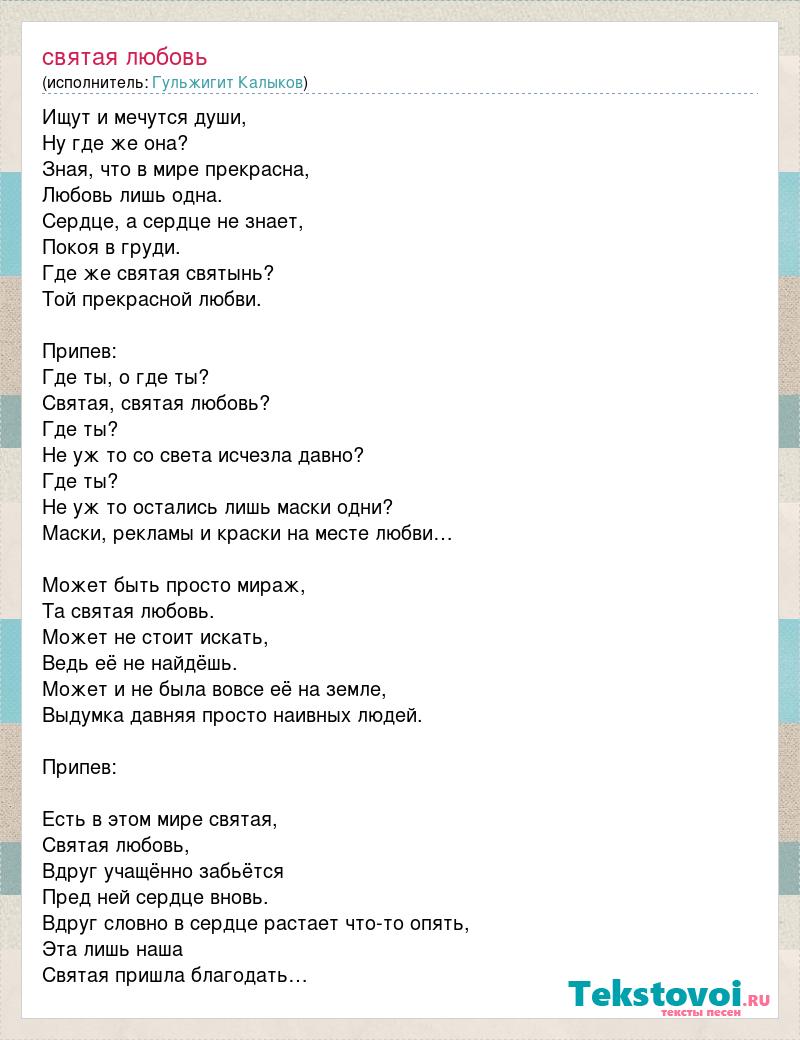 Ищут и мечутся души, Ну где же она? Зная, что в мире прекрасна, Любовь лишь одна. Сердце, а сердце не знает, Покоя в груди. Где же святая святынь? Той прекрасной любви. Припев: Где ты, о где ты? Святая, святая любовь? Где ты? Не уж то со света исчезла давно? Где ты? Не уж то остались лишь маски одни? Маски, рекламы и краски на месте любви… Может быть просто мираж, Та святая любовь. Может не стоит искать, Ведь её не найдёшь. Может и не была вовсе её на земле, Выдумка давняя просто наивных людей. Припев: Есть в этом мире святая, Святая любовь, Вдруг учащённо забьётся Пред ней сердце вновь. Вдруг словно в сердце растает что-то опять, Эта лишь наша Святая пришла благодать…