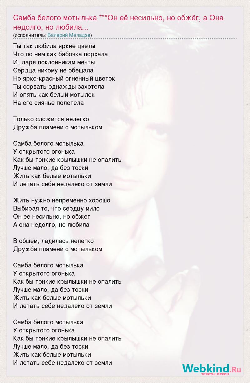 Главная→Исполнители→Валерий Меладзе→Самба белого мотылька ***Он её несильно, но обжёг, а Она недолго, но лю