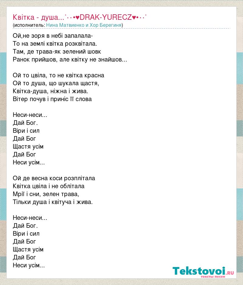 Ой,не зоря в небі запалала- То на землі квітка розквітала. Там, де трава-як зелений шовк Ранок прийшов, але квітку не знайшов... Ой то цвіла, то не квітка красна Ой то душа, що шукала щастя, Квітка-душа, ніжна і жива. Вітер почув і приніс її слова Неси-неси... Дай Бог. Віри і сил Дай Бог Щастя усім Дай Бог Неси усім... Ой де весна коси розплітала Квітка цвіла і не облітала Мрії і сни, зелен трава, Тільки душа і квітуча і жива. Неси-неси... Дай Бог. Віри і сил Дай Бог Щастя усім Дай Бог Неси усім...