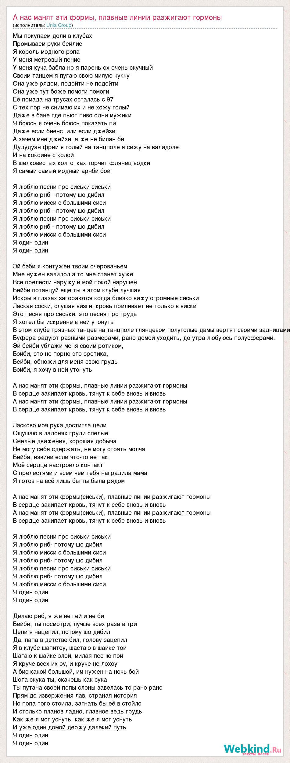 Мы покупаем доли в клубах Промываем руки бейлис Я король модного рэпа У меня метровый пенис У меня куча бабла но я парень ох очень скучный Своим танцем я пугаю свою милую чукчу Она уже рядом, подойти не подойти Она уже тут боже помоги помоги Её помада на трусах осталась с 97 С тех пор не снимаю их и не хожу голый Даже в бане где пьют пиво одни мужики Я боюсь я очень боюсь показать пи Даже если биёнс, или если джейзи А зачем мне джейзи, я же не билан би Дудудуан фрии я голый на танцполе я сижу на валидоле И на кокоине с колой В шелковистых колготках торчит флянец водки Я самый самый модный арнби бой Я люблю песни про сиськи сиськи Я люблю рнб - потому шо дибил Я люблю мисси с большими сиси Я люблю рнб - потому шо дибил Я люблю песни про сиськи сиськи Я люблю рнб - потому шо дибил Я люблю мисси с большими сиси Я один один Я один один Эй бэби я контужен твоим очерованьем Мне нужен валидол а то мне станет хуже Все прелести наружу и мой покой нарушен Бейби потанцуй еще ты в этом клубе лучшая Искры в глазах загораются когда близко вижу огромные сиськи Лаская соски, слушая визги, кровь приливает не только в виски Это песня про сиськи, это песня про грудь Я хотел бы искренне в ней утонуть В этом клубе грязных танцев на танцполе глянцевом полуголые дамы вертят своими задницами Буфера радуют разными размерами, рано домой уходить, до утра любуюсь полусферами. Эй бейби ублажи меня своим ротиком, Бэйби, это не порно это эротика, Бейби, обножи для меня свою грудь Бэйби, я хочу в ней утонуть А нас манят эти формы, плавные линии разжигают гормоны В сердце закипает кровь, тянут к себе вновь и вновь А нас манят эти формы, плавные линии разжигают гормоны В сердце закипает кровь, тянут к себе вновь и вновь Ласково моя рука достигла цели Ощущаю в ладонях груди спелые Смелые движения, хорошая добыча Не могу себя сдержать, не могу стоять молча Бейба, извини если что-то не так Моё сердце настроило контакт С прелестями и всем чем тебя наградила мама Я готов на всё лишь бы ты была рядом А нас манят эти формы(сиськи), плавные линии разжигают гормоны В сердце закипает кровь, тянут к себе вновь и вновь А нас манят эти формы(сиськи), плавные линии разжигают гормоны В сердце закипает кровь, тянут к себе вновь и вновь Я люблю песни про сиськи сиськи Я люблю рнб- потому шо дибил Я люблю мисси с большими сиси Я люблю рнб- потому шо дибил Я люблю песни про сиськи сиськи Я люблю рнб- потому шо дибил Я люблю мисси с большими сиси Я один один Я один один Делаю рнб, я же не гей и не би Бейби, ты посмотри, лучше всех раза в три Цепи я нацепил, потому шо дибил Да, папа в детстве бил, голову зацепил Я в клубе шапитоу, шастаю в шайке той Шагаю к шайке злой, милая песню пой Я круче всех их оу, и круче не лохоу А бис какой большой, им нужен на ночь бой Шота скука ты, скачешь как сука Ты путана своей попы слоны завелась то рано рано Прям до извержения лав, страная история Но попа того стоила, загнать бы её в стойло И столько планов ладно, главное ведь грудь Как же я мог уснуть, как же я мог уснуть И уже один домой держу далекий путь Я один один Я один один