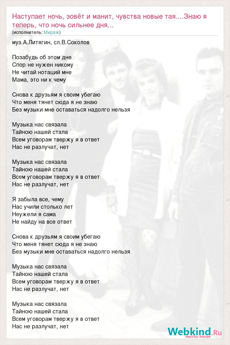 муз.А.Литягин, сл.В.Соколов Позабудь об этом дне Спор не нужен никому Не читай нотаций мне Мама, это ни к чему Снова к друзьям я своим убегаю Что меня тянет сюда я не знаю Без музыки мне оставаться надолго нельзя Музыка нас связала Тайною нашей стала Всем уговорам твержу я в ответ Нас не разлучат, нет Музыка нас связала Тайною нашей стала Всем уговорам твержу я в ответ Нас не разлучат, нет Я забыла все, чему Нас учили столько лет Неужели я сама Не найду на все ответ Снова к друзьям я своим убегаю Что меня тянет сюда я не знаю Без музыки мне оставаться надолго нельзя Музыка нас связала Тайною нашей стала Всем уговорам твержу я в ответ Нас не разлучат, нет Музыка нас связала Тайною нашей стала Всем уговорам твержу я в ответ Нас не разлучат, нет