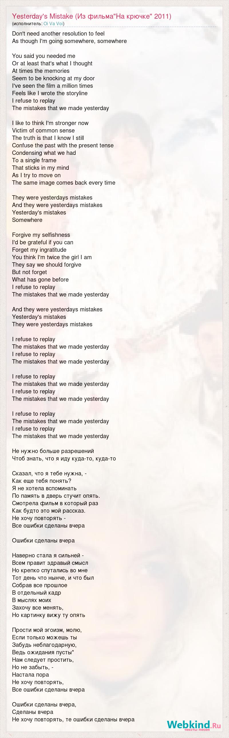 Don't need another resolution to feel As though I'm going somewhere, somewhere You said you needed me Or at least that's what I thought At times the memories Seem to be knocking at my door I've seen the film a million times Feels like I wrote the storyline I refuse to replay The mistakes that we made yesterday I like to think I'm stronger now Victim of common sense The truth is that I know I still Confuse the past with the present tense Condensing what we had To a single frame That sticks in my mind As I try to move on The same image comes back every time They were yesterdays mistakes And they were yesterdays mistakes Yesterday's mistakes Somewhere Forgive my selfishness I'd be grateful if you can Forget my ingratitude You think I'm twice the girl I am They say we should forgive But not forget What has gone before I refuse to replay The mistakes that we made yesterday And they were yesterdays mistakes Yesterday's mistakes They were yesterdays mistakes I refuse to replay The mistakes that we made yesterday I refuse to replay The mistakes that we made yesterday I refuse to replay The mistakes that we made yesterday I refuse to replay The mistakes that we made yesterday I refuse to replay The mistakes that we made yesterday I refuse to replay The mistakes that we made yesterday Не нужно больше разрешений Чтоб знать, что я иду куда-то, куда-то Сказал, что я тебе нужна, - Как еще тебя понять? Я не хотела вспоминать По память в дверь стучит опять. Смотрела фильм в который раз Как будто это мой рассказ. Не хочу повторять - Все ошибки сделаны вчера Ошибки сделаны вчера Наверно стала я сильней - Всем правит здравый смысл Но крепко спутались во мне Тот день что нынче, и что был Собрав все прошлое В отдельный кадр В мыслях моих Захочу все менять, Но картинку вижу ту опять Прости мой эгоизм, молю, Если только можешь ты Забудь неблагодарную, Ведь ожидания пусты* Нам следует простить, Но не забыть, - Настала пора Не хочу повторять, Все ошибки сделаны вчера Ошибки сделаны вчера, Сделаны вчера Не хочу повторять, те ошибки сделаны вчера