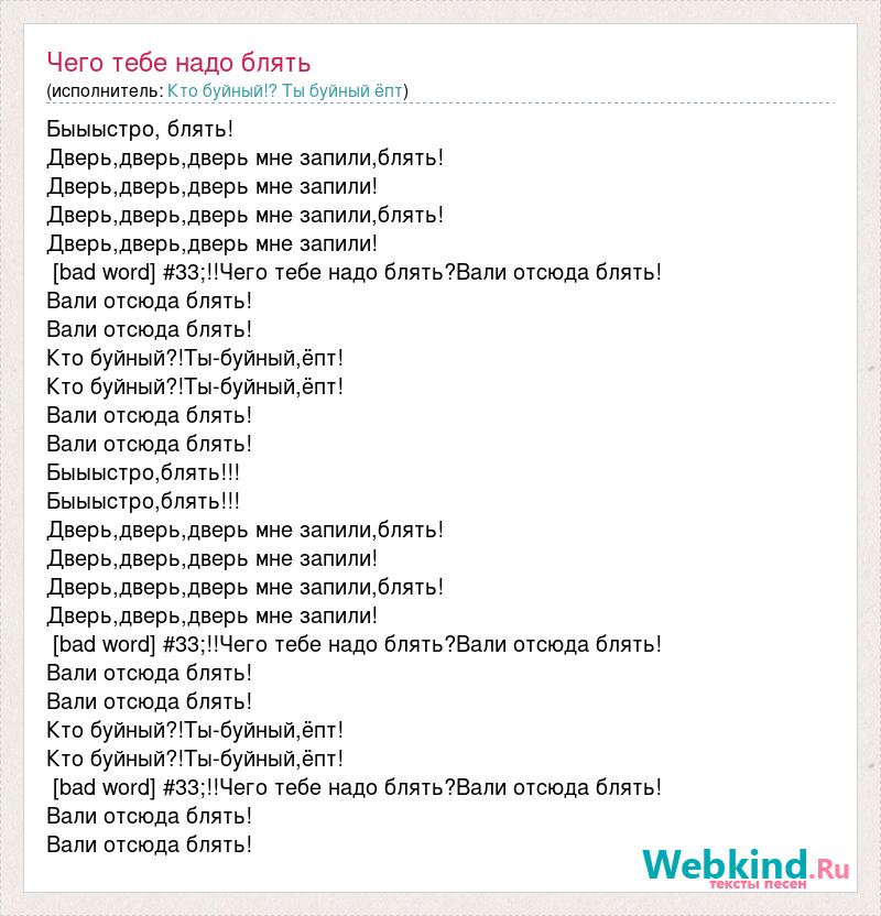 Быыыстро, блять! Дверь,дверь,дверь мне запили,блять! Дверь,дверь,дверь мне запили! Дверь,дверь,дверь мне запили,блять! Дверь,дверь,дверь мне запили! [bad word] #33;!!Чего тебе надо блять?Вали отсюда блять! Вали отсюда блять! Вали отсюда блять! Кто буйный?!Ты-буйный,ёпт! Кто буйный?!Ты-буйный,ёпт! Вали отсюда блять! Вали отсюда блять! Быыыстро,блять!!! Быыыстро,блять!!! Дверь,дверь,дверь мне запили,блять! Дверь,дверь,дверь мне запили! Дверь,дверь,дверь мне запили,блять! Дверь,дверь,дверь мне запили! [bad word] #33;!!Чего тебе надо блять?Вали отсюда блять! Вали отсюда блять! Вали отсюда блять! Кто буйный?!Ты-буйный,ёпт! Кто буйный?!Ты-буйный,ёпт! [bad word] #33;!!Чего тебе надо блять?Вали отсюда блять! Вали отсюда блять! Вали отсюда блять!