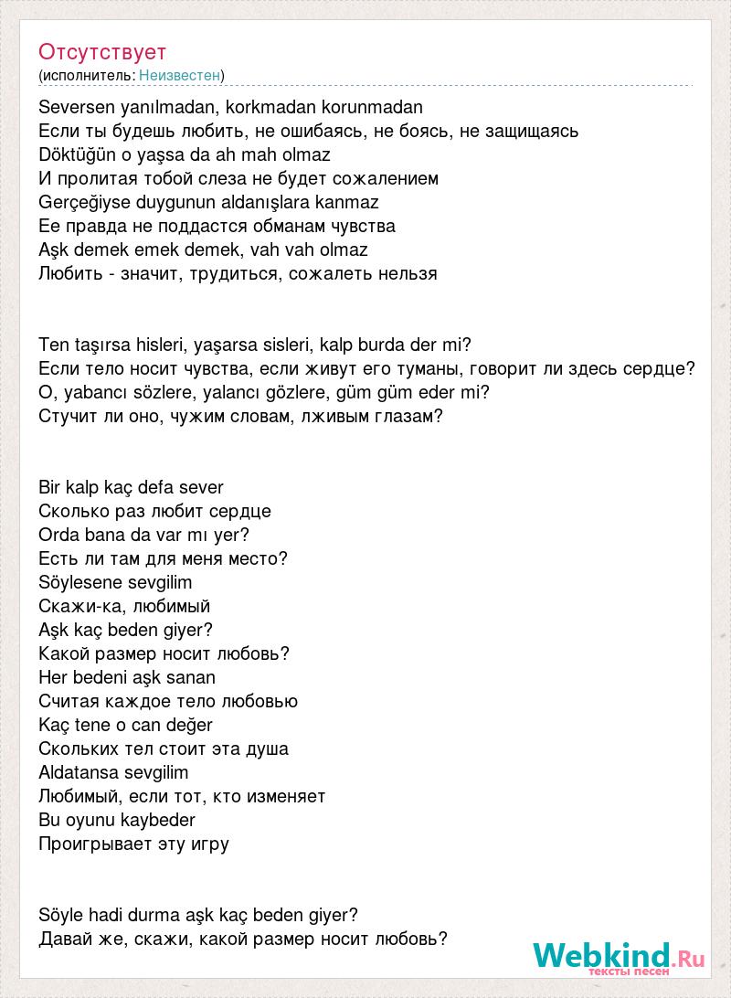 Seversen yanılmadan, korkmadan korunmadan Если ты будешь любить, не ошибаясь, не боясь, не защищаясь Döktüğün o yaşsa da ah mah olmaz И пролитая тобой слеза не будет сожалением Gerçeğiyse duygunun aldanışlara kanmaz Ее правда не поддастся обманам чувства Aşk demek emek demek, vah vah olmaz Любить - значит, трудиться, сожалеть нельзя Ten taşırsa hisleri, yaşarsa sisleri, kalp burda der mi? Если тело носит чувства, если живут его туманы, говорит ли здесь сердце? O, yabancı sözlere, yalancı gözlere, güm güm eder mi? Стучит ли оно, чужим словам, лживым глазам? Bir kalp kaç defa sever Сколько раз любит сердце Orda bana da var mı yer? Есть ли там для меня место? Söylesene sevgilim Скажи-ка, любимый Aşk kaç beden giyer? Какой размер носит любовь? Her bedeni aşk sanan Считая каждое тело любовью Kaç tene o can değer Скольких тел стоит эта душа Aldatansa sevgilim Любимый, если тот, кто изменяет Bu oyunu kaybeder Проигрывает эту игру Söyle hadi durma aşk kaç beden giyer? Давай же, скажи, какой размер носит любовь?