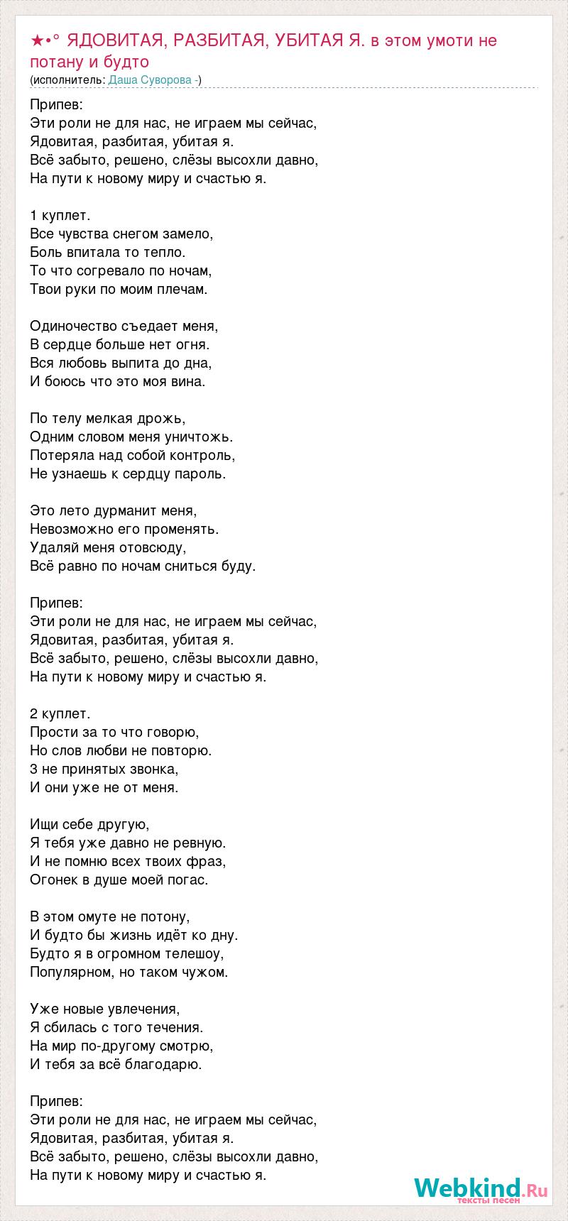 Припев: Эти роли не для нас, не играем мы сейчас, Ядовитая, разбитая, убитая я. Всё забыто, решено, слёзы высохли давно, На пути к новому миру и счастью я. 1 куплет. Все чувства снегом замело, Боль впитала то тепло. То что согревало по ночам, Твои руки по моим плечам. Одиночество съедает меня, В сердце больше нет огня. Вся любовь выпита до дна, И боюсь что это моя вина. По телу мелкая дрожь, Одним словом меня уничтожь. Потеряла над собой контроль, Не узнаешь к сердцу пароль. Это лето дурманит меня, Невозможно его променять. Удаляй меня отовсюду, Всё равно по ночам сниться буду. Припев: Эти роли не для нас, не играем мы сейчас, Ядовитая, разбитая, убитая я. Всё забыто, решено, слёзы высохли давно, На пути к новому миру и счастью я. 2 куплет. Прости за то что говорю, Но слов любви не повторю. 3 не принятых звонка, И они уже не от меня. Ищи себе другую, Я тебя уже давно не ревную. И не помню всех твоих фраз, Огонек в душе моей погас. В этом омуте не потону, И будто бы жизнь идёт ко дну. Будто я в огромном телешоу, Популярном, но таком чужом. Уже новые увлечения, Я сбилась с того течения. На мир по-другому смотрю, И тебя за всё благодарю. Припев: Эти роли не для нас, не играем мы сейчас, Ядовитая, разбитая, убитая я. Всё забыто, решено, слёзы высохли давно, На пути к новому миру и счастью я.
