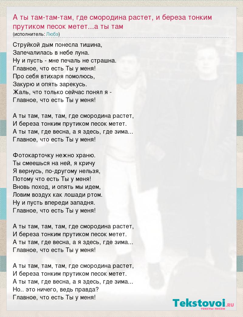 Струйкой дым понесла тишина, Запечалилась в небе луна. Ну и пусть - мне печаль не страшна. Главное, что есть Ты у меня! Про себя втихаря помолюсь, Закурю и опять зарекусь. Жаль, что только сейчас понял я - Главное, что есть Ты у меня! А ты там, там, там, где смородина растет, И береза тонким прутиком песок метет. А ты там, где весна, а я здесь, где зима... Главное, что есть Ты у меня! Фотокарточку нежно храню. Ты смеешься на ней, я кричу Я вернусь, по-другому нельзя, Потому что есть Ты у меня! Вновь поход, и опять мы идем, Ловим воздух как лошади ртом. Ну и пусть впереди западня. Главное, что есть Ты у меня! А ты там, там, там, где смородина растет, И береза тонким прутиком песок метет. А ты там, где весна, а я здесь, где зима... Главное, что есть Ты у меня! А ты там, там, там, где смородина растет, И береза тонким прутиком песок метет. А ты там, где весна, а я здесь, где зима... Но.. это ничего, ведь правда? Главное, что есть Ты у меня!