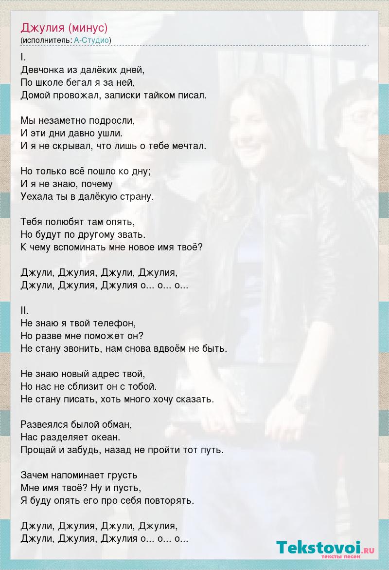 I. Девчонка из далёких дней, По школе бегал я за ней, Домой провожал, записки тайком писал. Мы незаметно подросли, И эти дни давно ушли. И я не скрывал, что лишь о тебе мечтал. Но только всё пошло ко дну; И я не знаю, почему Уехала ты в далёкую страну. Тебя полюбят там опять, Но будут по другому звать. К чему вспоминать мне новое имя твоё? Джули, Джулия, Джули, Джулия, Джули, Джулия, Джулия о... о... о... II. Не знаю я твой телефон, Но разве мне поможет он? Не стану звонить, нам снова вдвоём не быть. Не знаю новый адрес твой, Но нас не сблизит он с тобой. Не стану писать, хоть много хочу сказать. Развеялся былой обман, Нас разделяет океан. Прощай и забудь, назад не пройти тот путь. Зачем напоминает грусть Мне имя твоё? Ну и пусть, Я буду опять его про себя повторять. Джули, Джулия, Джули, Джулия, Джули, Джулия, Джулия о... о... о...
