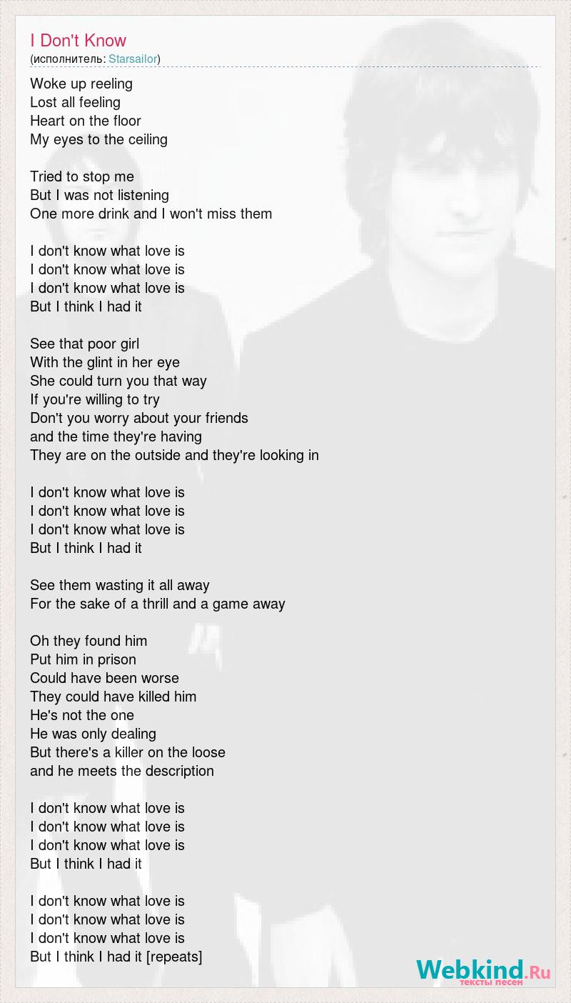 Woke up reeling Lost all feeling Heart on the floor My eyes to the ceiling Tried to stop me But I was not listening One more drink and I won't miss them I don't know what love is I don't know what love is I don't know what love is But I think I had it See that poor girl With the glint in her eye She could turn you that way If you're willing to try Don't you worry about your friends and the time they're having They are on the outside and they're looking in I don't know what love is I don't know what love is I don't know what love is But I think I had it See them wasting it all away For the sake of a thrill and a game away Oh they found him Put him in prison Could have been worse They could have killed him He's not the one He was only dealing But there's a killer on the loose and he meets the description I don't know what love is I don't know what love is I don't know what love is But I think I had it I don't know what love is I don't know what love is I don't know what love is But I think I had it [repeats]