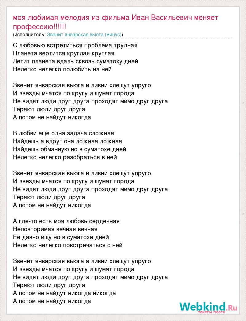 С любовью встретиться проблема трудная Планета вертится круглая круглая Летит планета вдаль сквозь суматоху дней Нелегко нелегко полюбить на ней Звенит январская вьюга и ливни хлещут упруго И звезды мчатся по кругу и шумят города Не видят люди друг друга проходят мимо друг друга Теряют люди друг друга А потом не найдут никогда В любви еще одна задача сложная Найдешь а вдруг она ложная ложная Найдешь обманную но в суматохе дней Нелегко нелегко разобраться в ней Звенит январская вьюга и ливни хлещут упруго И звезды мчатся по кругу и шумят города Не видят люди друг друга проходят мимо друг друга Теряют люди друг друга А потом не найдут никогда А где-то есть моя любовь сердечная Неповторимая вечная вечная Ее давно ищу но в суматохе дней Нелегко нелегко повстречаться с ней Звенит январская вьюга а ливни хлещут упруго И звезды мчатся по кругу и шумят города Не видят люди друг друга проходят мимо друг друга Теряют люди друг друга А потом не найдут никогда никогда А потом не найдут никогда
