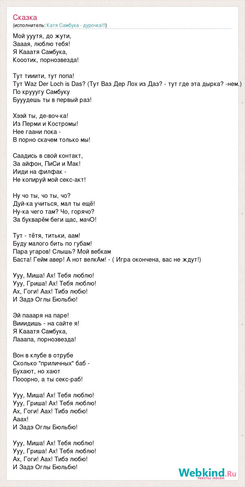 Мой ууутя, до жути, Зааая, люблю тебя! Я Kааатя Самбука, Кооотик, порнозвезда! Тут тииити, тут попа! Тут Waz Der Loсh is Das? (Тут Ваз Дер Лох из Даз? - тут где эта дырка? -нем.) По крууугу Самбуку Бууудешь ты в первый раз! Хээй ты, де-воч-ка! Из Перми и Костромы! Нее гаани пока - В порно скачем только мы! Саадись в свой контакт, За айфон, ПиСи и Мак! Ииди на филфак - Не копируй мой секс-акт! Ну чо ты, чо ты, чо? Дуй-ка учиться, мал ты ещё! Ну-ка чего там? Чо, горячо? За букварём беги щас, мачО! Тут - тётя, титьки, аам! Буду малого бить по губам! Пара угаров! Слышь? Мой вебкам Баста! Гейм авер! А нот велкАм! - ( Игра окончена, вас не ждут!) Ууу, Миша! Ах! Тебя люблю! Ууу, Гриша! Ах! Тебя люблю! Ах, Гоги! Аах! Тибэ любю! И Задэ Оглы Бюльбю! Эй паааря на паре! Вииидишь - на сайте я! Я Кааатя Самбука, Лааапа, порнозвезда! Вон в клубе в отрубе Сколько "приличных" баб - Бухают, но хают Пооорно, а ты секс-раб! Ууу, Миша! Ах! Тебя люблю! Ууу, Гриша! Ах! Тебя люблю! Ах, Гоги! Аах! Тибэ любю! Ааах! И Задэ Оглы Бюльбю! Ууу, Миша! Ах! Тебя люблю! Ууу, Гриша! Ах! Тебя люблю! Ах, Гоги! Аах! Тибэ любю! И Задэ Оглы Бюльбю!