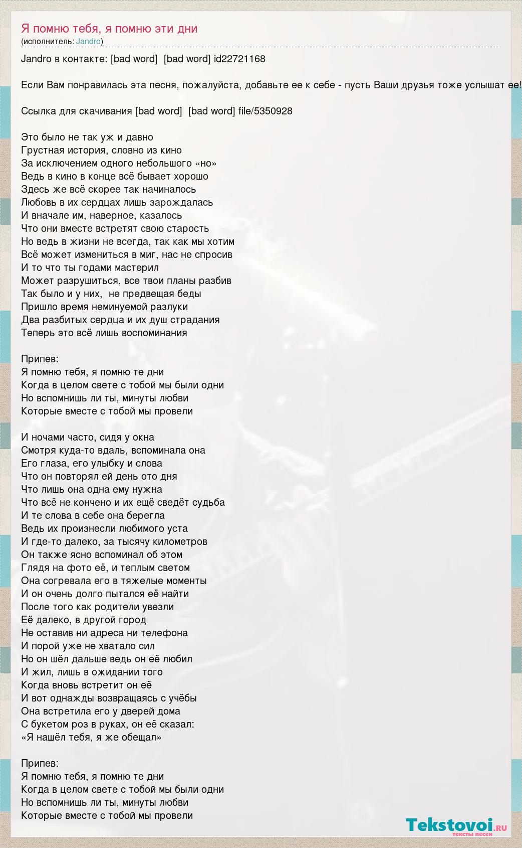Jandro в контакте: [bad word] [bad word] id22721168 Если Вам понравилась эта песня, пожалуйста, добавьте ее к себе - пусть Ваши друзья тоже услышат ее! Ссылка для скачивания [bad word] [bad word] file/5350928 Это было не так уж и давно Грустная история, словно из кино За исключением одного небольшого «но» Ведь в кино в конце всё бывает хорошо Здесь же всё скорее так начиналось Любовь в их сердцах лишь зарождалась И вначале им, наверное, казалось Что они вместе встретят свою старость Но ведь в жизни не всегда, так как мы хотим Всё может измениться в миг, нас не спросив И то что ты годами мастерил Может разрушиться, все твои планы разбив Так было и у них, не предвещая беды Пришло время неминуемой разлуки Два разбитых сердца и их душ страдания Теперь это всё лишь воспоминания Припев: Я помню тебя, я помню те дни Когда в целом свете с тобой мы были одни Но вспомнишь ли ты, минуты любви Которые вместе с тобой мы провели И ночами часто, сидя у окна Смотря куда-то вдаль, вспоминала она Его глаза, его улыбку и слова Что он повторял ей день ото дня Что лишь она одна ему нужна Что всё не кончено и их ещё сведёт судьба И те слова в себе она берегла Ведь их произнесли любимого уста И где-то далеко, за тысячу километров Он также ясно вспоминал об этом Глядя на фото её, и теплым светом Она согревала его в тяжелые моменты И он очень долго пытался её найти После того как родители увезли Её далеко, в другой город Не оставив ни адреса ни телефона И порой уже не хватало сил Но он шёл дальше ведь он её любил И жил, лишь в ожидании того Когда вновь встретит он её И вот однажды возвращаясь с учёбы Она встретила его у дверей дома С букетом роз в руках, он её сказал: «Я нашёл тебя, я же обещал» Припев: Я помню тебя, я помню те дни Когда в целом свете с тобой мы были одни Но вспомнишь ли ты, минуты любви Которые вместе с тобой мы провели