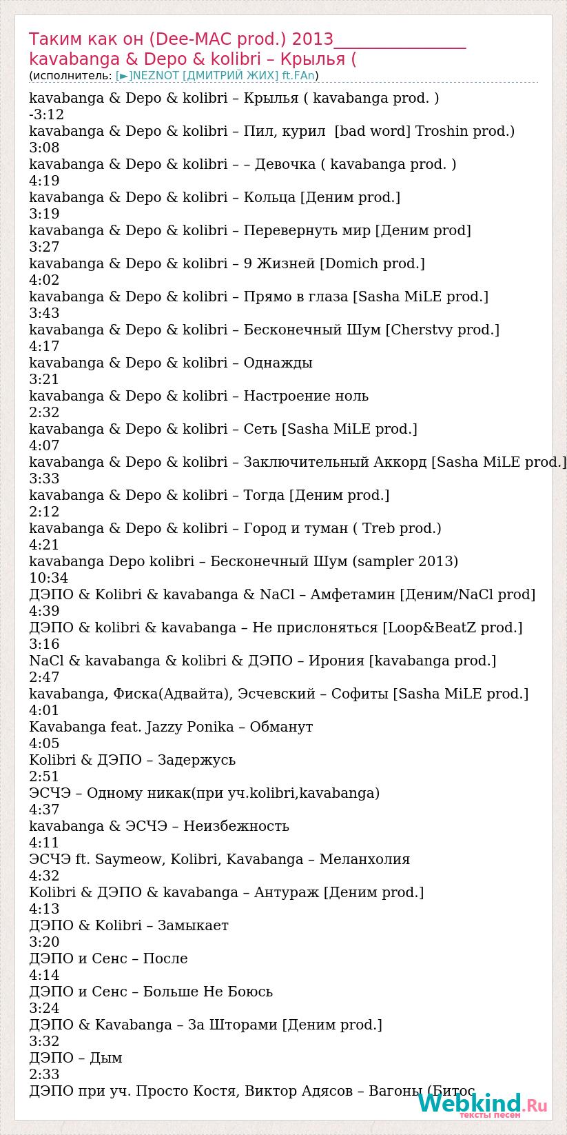 kavabanga & Depo & kolibri – Крылья ( kavabanga prod. ) -3:12 kavabanga & Depo & kolibri – Пил, курил [bad word] Troshin prod.) 3:08 kavabanga & Depo & kolibri – – Девочка ( kavabanga prod. ) 4:19 kavabanga & Depo & kolibri – Кольца [Деним prod.] 3:19 kavabanga & Depo & kolibri – Перевернуть мир [Деним prod] 3:27 kavabanga & Depo & kolibri – 9 Жизней [Domich prod.] 4:02 kavabanga & Depo & kolibri – Прямо в глаза [Sasha MiLE prod.] 3:43 kavabanga & Depo & kolibri – Бесконечный Шум [Cherstvy prod.] 4:17 kavabanga & Depo & kolibri – Однажды 3:21 kavabanga & Depo & kolibri – Настроение ноль 2:32 kavabanga & Depo & kolibri – Сеть [Sasha MiLE prod.] 4:07 kavabanga & Depo & kolibri – Заключительный Аккорд [Sasha MiLE prod.] 3:33 kavabanga & Depo & kolibri – Тогда [Деним prod.] 2:12 kavabanga & Depo & kolibri – Город и туман ( Treb prod.) 4:21 kavabanga Depo kolibri – Бесконечный Шум (sampler 2013) 10:34 ДЭПО & Kolibri & kavabanga & NaCl – Амфетамин [Деним/NaCl prod] 4:39 ДЭПО & kolibri & kavabanga – Не прислоняться [Loop&BeatZ prod.] 3:16 NaCl & kavabanga & kolibri & ДЭПО – Ирония [kavabanga prod.] 2:47 kavabanga, Фиска(Адвайта), Эсчевский – Софиты [Sasha MiLE prod.] 4:01 Kavabanga feat. Jazzy Ponika – Обманут 4:05 Kolibri & ДЭПО – Задержусь 2:51 ЭСЧЭ – Одному никак(при уч.kolibri,kavabanga) 4:37 kavabanga & ЭСЧЭ – Неизбежность 4:11 ЭСЧЭ ft. Saymeow, Kolibri, Kavabanga – Меланхолия 4:32 Kolibri & ДЭПО & kavabanga – Антураж [Деним prod.] 4:13 ДЭПО & Kolibri – Замыкает 3:20 ДЭПО и Сенс – После 4:14 ДЭПО и Сенс – Больше Не Боюсь 3:24 ДЭПО & Kavabanga – За Шторами [Деним prod.] 3:32 ДЭПО – Дым 2:33 ДЭПО при уч. Просто Костя, Виктор Адясов – Вагоны (Битос