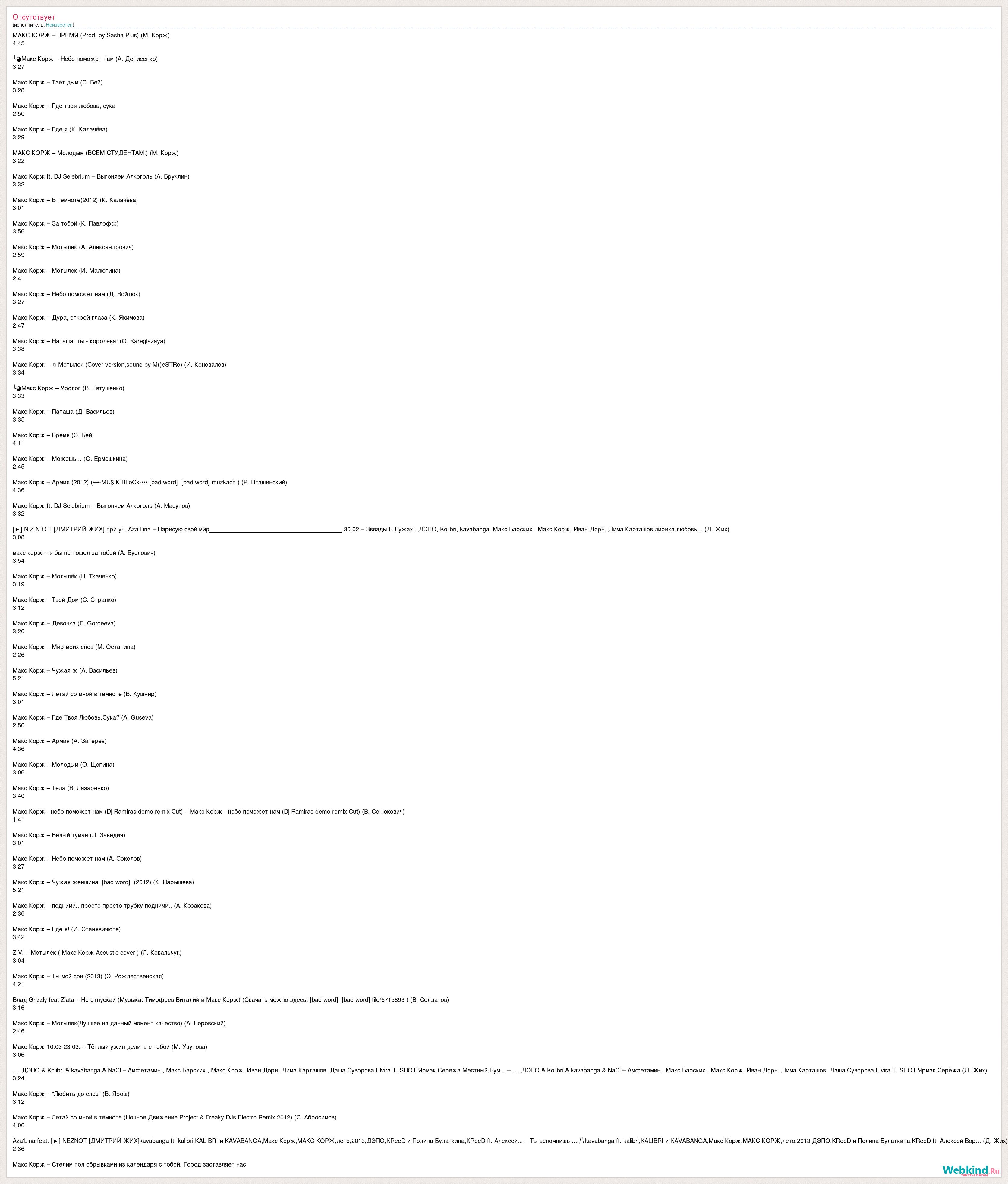 МАКС КОРЖ – ВРЕМЯ (Prod. by Sasha Plus) (М. Корж) 4:45 ╰◕Макс Корж – Небо поможет нам (А. Денисенко) 3:27 Макс Корж – Тает дым (С. Бей) 3:28 Макс Корж – Где твоя любовь, сука 2:50 Макс Корж – Где я (К. Калачёва) 3:29 МАКС КОРЖ – Молодым (ВСЕМ СТУДЕНТАМ:) (М. Корж) 3:22 Макс Корж ft. DJ Selebrium – Выгоняем Алкоголь (А. Бруклин) 3:32 Макс Корж – В темноте(2012) (К. Калачёва) 3:01 Макс Корж – За тобой (К. Павлофф) 3:56 Макс Корж – Мотылек (А. Александрович) 2:59 Макс Корж – Мотылек (И. Малютина) 2:41 Макс Корж – Небо поможет нам (Д. Войтюк) 3:27 Макс Корж – Дура, открой глаза (К. Якимова) 2:47 Макс Корж – Наташа, ты - королева! (O. Kareglazaya) 3:38 Макс Корж – ♫ Мотылек (Cover version,sound by M()eSTRo) (И. Коновалов) 3:34 ╰◕Макс Корж – Уролог (В. Евтушенко) 3:33 Макс Корж – Папаша (Д. Васильев) 3:35 Макс Корж – Время (С. Бей) 4:11 Макс Корж – Можешь... (О. Ермошкина) 2:45 Макс Корж – Армия (2012) (•••-MU$IК BLoCk-••• [bad word] [bad word] muzkach ) (Р. Пташинский) 4:36 Макс Корж ft. DJ Selebrium – Выгоняем Алкоголь (А. Масунов) 3:32 [►] N Z N O T [ДМИТРИЙ ЖИХ] при уч. Aza'Lina – Нарисую свой мир________________________________________ 30.02 – Звёзды В Лужах , ДЭПО, Kolibri, kavabanga, Макс Барских , Макс Корж, Иван Дорн, Дима Карташов,лирика,любовь... (Д. Жих) 3:08 макс корж – я бы не пошел за тобой (А. Буслович) 3:54 Макс Корж – Мотылёк (Н. Ткаченко) 3:19 Макс Корж – Твой Дом (С. Страпко) 3:12 Макс Корж – Девочка (E. Gordeeva) 3:20 Макс Корж – Мир моих снов (М. Останина) 2:26 Макс Корж – Чужая ж (А. Васильев) 5:21 Макс Корж – Летай со мной в темноте (В. Кушнир) 3:01 Макс Корж – Где Твоя Любовь,Сука? (A. Guseva) 2:50 Макс Корж – Армия (А. Зитерев) 4:36 Макс Корж – Молодым (О. Щепина) 3:06 Макс Корж – Тела (В. Лазаренко) 3:40 Макс Корж - небо поможет нам (Dj Ramiras demo remix Cut) – Макс Корж - небо поможет нам (Dj Ramiras demo remix Cut) (В. Сенюкович) 1:41 Макс Корж – Белый туман (Л. Заведия) 3:01 Макс Корж – Небо поможет нам (А. Соколов) 3:27 Макс Корж – Чужая женщина [bad word] (2012) (К. Нарышева) 5:21 Макс Корж – подними.. просто просто трубку подними.. (А. Козакова) 2:36 Макс Корж – Где я! (И. Станявичюте) 3:42 Z.V. – Мотылёк ( Макс Корж Acoustic cover ) (Л. Ковальчук) 3:04 Макс Корж – Ты мой сон (2013) (Э. Рождественская) 4:21 Влад Grizzly feat Zlata – Не отпускай (Музыка: Тимофеев Виталий и Макс Корж) (Скачать можно здесь: [bad word] [bad word] file/5715893 ) (В. Солдатов) 3:16 Макс Корж – Мотылёк(Лучшее на данный момент качество) (А. Боровский) 2:46 Макс Корж 10.03 23.03. – Тёплый ужин делить с тобой (М. Узунова) 3:06 ..., ДЭПО & Kolibri & kavabanga & NaCl – Амфетамин , Макс Барских , Макс Корж, Иван Дорн, Дима Карташов, Даша Суворова,Elvira T, SHOT,Ярмак,Серёжа Местный,Бум... – ..., ДЭПО & Kolibri & kavabanga & NaCl – Амфетамин , Макс Барских , Макс Корж, Иван Дорн, Дима Карташов, Даша Суворова,Elvira T, SHOT,Ярмак,Серёжа (Д. Жих) 3:24 Макс Корж – "Любить до слез" (В. Ярош) 3:12 Макс Корж – Летай со мной в темноте (Ночное Движение Project & Freaky DJs Electro Remix 2012) (С. Абросимов) 4:06 Aza'Lina feat. [►] NEZNOT [ДМИТРИЙ ЖИХ]kavabanga ft. kalibri,KALIBRI и KAVABANGA,Макс Корж,МАКС КОРЖ,лето,2013,ДЭПО,KReeD и Полина Булаткина,KReeD ft. Алексей... – Ты вспомнишь ...⎷⎛⎝kavabanga ft. kalibri,KALIBRI и KAVABANGA,Макс Корж,МАКС КОРЖ,лето,2013,ДЭПО,KReeD и Полина Булаткина,KReeD ft. Алексей Вор... (Д. Жих) 2:36 Макс Корж – Стелим пол обрывками из календаря с тобой. Город заставляет нас