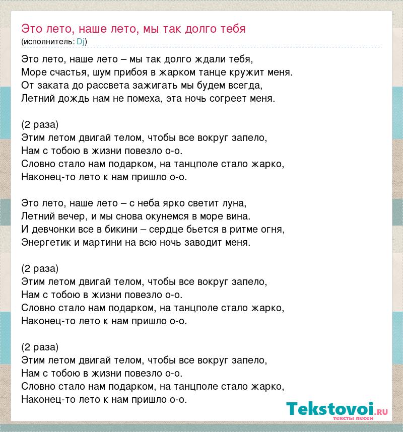 Это лето, наше лето – мы так долго ждали тебя, Море счастья, шум прибоя в жарком танце кружит меня. От заката до рассвета зажигать мы будем всегда, Летний дождь нам не помеха, эта ночь согреет меня. (2 раза) Этим летом двигай телом, чтобы все вокруг запело, Нам с тобою в жизни повезло о-о. Словно стало нам подарком, на танцполе стало жарко, Наконец-то лето к нам пришло о-о. Это лето, наше лето – с неба ярко светит луна, Летний вечер, и мы снова окунемся в море вина. И девчонки все в бикини – сердце бьется в ритме огня, Энергетик и мартини на всю ночь заводит меня. (2 раза) Этим летом двигай телом, чтобы все вокруг запело, Нам с тобою в жизни повезло о-о. Словно стало нам подарком, на танцполе стало жарко, Наконец-то лето к нам пришло о-о. (2 раза) Этим летом двигай телом, чтобы все вокруг запело, Нам с тобою в жизни повезло о-о. Словно стало нам подарком, на танцполе стало жарко, Наконец-то лето к нам пришло о-о.