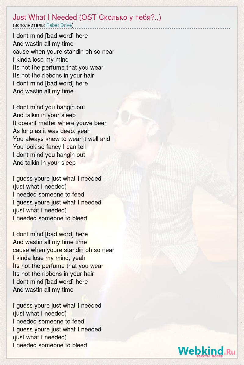 I dont mind [bad word] here And wastin all my time cause when youre standin oh so near I kinda lose my mind Its not the perfume that you wear Its not the ribbons in your hair I dont mind [bad word] here And wastin all my time I dont mind you hangin out And talkin in your sleep It doesnt matter where youve been As long as it was deep, yeah You always knew to wear it well and You look so fancy I can tell I dont mind you hangin out And talkin in your sleep I guess youre just what I needed (just what I needed) I needed someone to feed I guess youre just what I needed (just what I needed) I needed someone to bleed I dont mind [bad word] here And wastin all my time time cause when youre standin oh so near I kinda lose my mind, yeah Its not the perfume that you wear Its not the ribbons in your hair I dont mind [bad word] here And wastin all my time I guess youre just what I needed (just what I needed) I needed someone to feed I guess youre just what I needed (just what I needed) I needed someone to bleed
