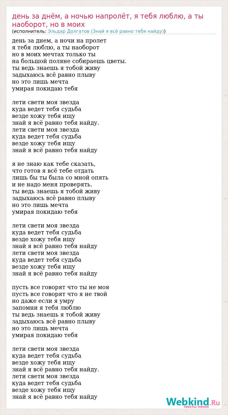 день за днем, а ночи на пролет я тебя люблю, а ты наоборот но в моих мечтах только ты на большой поляне собираешь цветы. ты ведь знаешь я тобой живу задыхаюсь всё равно плыву но это лишь мечта умирая покидаю тебя лети свети моя звезда куда ведет тебя судьба везде хожу тебя ищу знай я всё равно тебя найду. лети свети моя звезда куда ведет тебя судьба везде хожу тебя ищу знай я всё равно тебя найду я не знаю как тебе сказать, что готов я всё тебе отдать лишь бы ты была со мной опять и не надо меня проверять. ты ведь знаешь я тобой живу задыхаюсь всё равно плыву но это лишь мечта умирая покидаю тебя лети свети моя звезда куда ведет тебя судьба везде хожу тебя ищу знай я всё равно тебя найду лети свети моя звезда куда ведет тебя судьба везде хожу тебя ищу знай я всё равно тебя найду пусть все говорят что ты не моя пусть все говорят что я не твой но даже если я умру запомни я тебя люблю ты ведь знаешь я тобой живу задыхаюсь всё равно плыву но это лишь мечта умирая покидаю тебя лети свети моя звезда куда ведет тебя судьба везде хожу тебя ищу знай я всё равно тебя найду. лети свети моя звезда куда ведет тебя судьба везде хожу тебя ищу знай я всё равно тебя найду