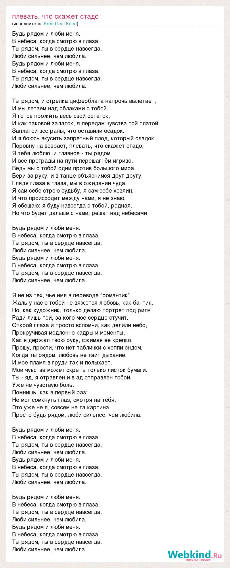 Будь рядом и люби меня. В небеса, когда смотрю в глаза. Ты рядом, ты в сердце навсегда. Люби сильнее, чем любила. Будь рядом и люби меня. В небеса, когда смотрю в глаза. Ты рядом, ты в сердце навсегда. Люби сильнее, чем любила. Ты рядом, и стрелка циферблата напрочь вылетает, И мы летаем над облаками с тобой. Я готов прожить весь свой остаток, И как таковой задаток, я передам чувства той платой. Заплатой все раны, что оставили осадок. И я боюсь вкусить запретный плод, который сладок. Поровну на возраст, плевать, что скажет стадо, Я тебя люблю, и главное - ты рядом. И все преграды на пути перешагнём игриво. Ведь мы с тобой одни против большого мира. Бери за руку, и в танце объяснимся друг другу. Глядя глаза в глаза, мы в ожидании чуда. Я сам себе строю судьбу, я сам себе хозяин. И что происходит между нами, я не знаю. Я обещаю: я буду навсегда с тобой, родная. Но что будет дальше с нами, решат над небесами Будь рядом и люби меня. В небеса, когда смотрю в глаза. Ты рядом, ты в сердце навсегда. Люби сильнее, чем любила. Будь рядом и люби меня. В небеса, когда смотрю в глаза. Ты рядом, ты в сердце навсегда. Люби сильнее, чем любила. Я не из тех, чье имя в переводе "романтик". Жаль у нас с тобой не вяжется любовь, как бантик. Но, как художник, только делаю портрет под ритм Ради лишь той, за кого мое сердце стучит. Открой глаза и просто вспомни, как делили небо, Прокручивая медленно кадры и моменты, Как я держал твою руку, сжимая ее крепко. Прошу, прости, что нет таблички с хеппи эндом. Когда ты рядом, любовь не таит дыхание, И мое пламя в груди так и полыхает. Мои чувства может скрыть только листок бумаги. Ты - яд, я отравлен и в ад отправлен тобой. Уже не чувствую боль. Помнишь, как в первый раз: Не мог сомкнуть глаз, смотря на тебя. Это уже не я, совсем не та картина. Просто будь рядом, люби сильнее, чем любила. Будь рядом и люби меня. В небеса, когда смотрю в глаза. Ты рядом, ты в сердце навсегда. Люби сильнее, чем любила. Будь рядом и люби меня. В небеса, когда смотрю в глаза. Ты рядом, ты в сердце навсегда. Люби сильнее, чем любила. Будь рядом и люби меня. В небеса, когда смотрю в глаза. Ты рядом, ты в сердце навсегда. Люби сильнее, чем любила. Будь рядом и люби меня. В небеса, когда смотрю в глаза. Ты рядом, ты в сердце навсегда. Люби сильнее, чем любила.
