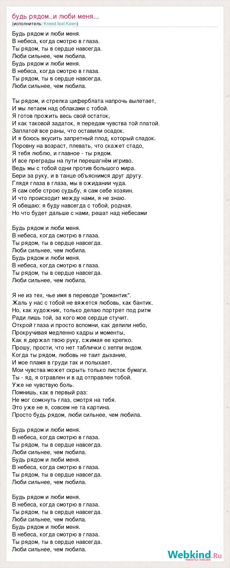 Будь рядом и люби меня. В небеса, когда смотрю в глаза. Ты рядом, ты в сердце навсегда. Люби сильнее, чем любила. Будь рядом и люби меня. В небеса, когда смотрю в глаза. Ты рядом, ты в сердце навсегда. Люби сильнее, чем любила. Ты рядом, и стрелка циферблата напрочь вылетает, И мы летаем над облаками с тобой. Я готов прожить весь свой остаток, И как таковой задаток, я передам чувства той платой. Заплатой все раны, что оставили осадок. И я боюсь вкусить запретный плод, который сладок. Поровну на возраст, плевать, что скажет стадо, Я тебя люблю, и главное - ты рядом. И все преграды на пути перешагнём игриво. Ведь мы с тобой одни против большого мира. Бери за руку, и в танце объяснимся друг другу. Глядя глаза в глаза, мы в ожидании чуда. Я сам себе строю судьбу, я сам себе хозяин. И что происходит между нами, я не знаю. Я обещаю: я буду навсегда с тобой, родная. Но что будет дальше с нами, решат над небесами Будь рядом и люби меня. В небеса, когда смотрю в глаза. Ты рядом, ты в сердце навсегда. Люби сильнее, чем любила. Будь рядом и люби меня. В небеса, когда смотрю в глаза. Ты рядом, ты в сердце навсегда. Люби сильнее, чем любила. Я не из тех, чье имя в переводе "романтик". Жаль у нас с тобой не вяжется любовь, как бантик. Но, как художник, только делаю портрет под ритм Ради лишь той, за кого мое сердце стучит. Открой глаза и просто вспомни, как делили небо, Прокручивая медленно кадры и моменты, Как я держал твою руку, сжимая ее крепко. Прошу, прости, что нет таблички с хеппи эндом. Когда ты рядом, любовь не таит дыхание, И мое пламя в груди так и полыхает. Мои чувства может скрыть только листок бумаги. Ты - яд, я отравлен и в ад отправлен тобой. Уже не чувствую боль. Помнишь, как в первый раз: Не мог сомкнуть глаз, смотря на тебя. Это уже не я, совсем не та картина. Просто будь рядом, люби сильнее, чем любила. Будь рядом и люби меня. В небеса, когда смотрю в глаза. Ты рядом, ты в сердце навсегда. Люби сильнее, чем любила. Будь рядом и люби меня. В небеса, когда смотрю в глаза. Ты рядом, ты в сердце навсегда. Люби сильнее, чем любила. Будь рядом и люби меня. В небеса, когда смотрю в глаза. Ты рядом, ты в сердце навсегда. Люби сильнее, чем любила. Будь рядом и люби меня. В небеса, когда смотрю в глаза. Ты рядом, ты в сердце навсегда. Люби сильнее, чем любила.