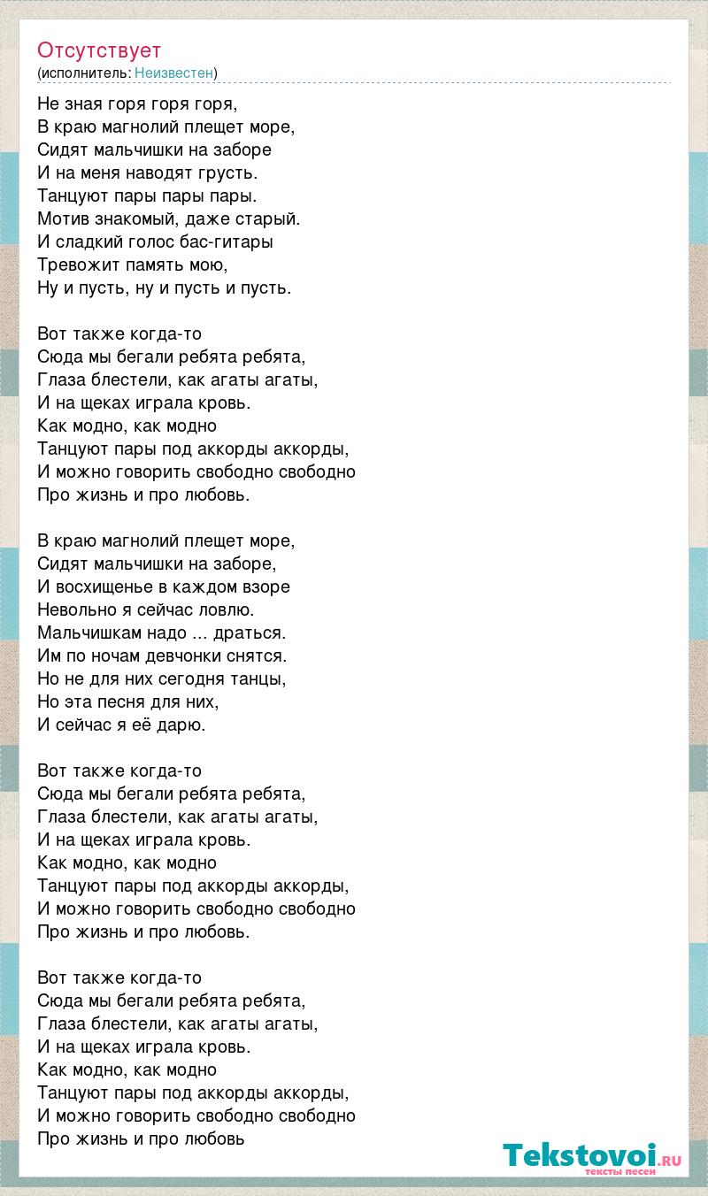 Не зная горя горя горя, В краю магнолий плещет море, Сидят мальчишки на заборе И на меня наводят грусть. Танцуют пары пары пары. Мотив знакомый, даже старый. И сладкий голос бас-гитары Тревожит память мою, Ну и пусть, ну и пусть и пусть. Вот также когда-то Сюда мы бегали ребята ребята, Глаза блестели, как агаты агаты, И на щеках играла кровь. Как модно, как модно Танцуют пары под аккорды аккорды, И можно говорить свободно свободно Про жизнь и про любовь. В краю магнолий плещет море, Сидят мальчишки на заборе, И восхищенье в каждом взоре Невольно я сейчас ловлю. Мальчишкам надо ... драться. Им по ночам девчонки снятся. Но не для них сегодня танцы, Но эта песня для них, И сейчас я её дарю. Вот также когда-то Сюда мы бегали ребята ребята, Глаза блестели, как агаты агаты, И на щеках играла кровь. Как модно, как модно Танцуют пары под аккорды аккорды, И можно говорить свободно свободно Про жизнь и про любовь. Вот также когда-то Сюда мы бегали ребята ребята, Глаза блестели, как агаты агаты, И на щеках играла кровь. Как модно, как модно Танцуют пары под аккорды аккорды, И можно говорить свободно свободно Про жизнь и про любовь