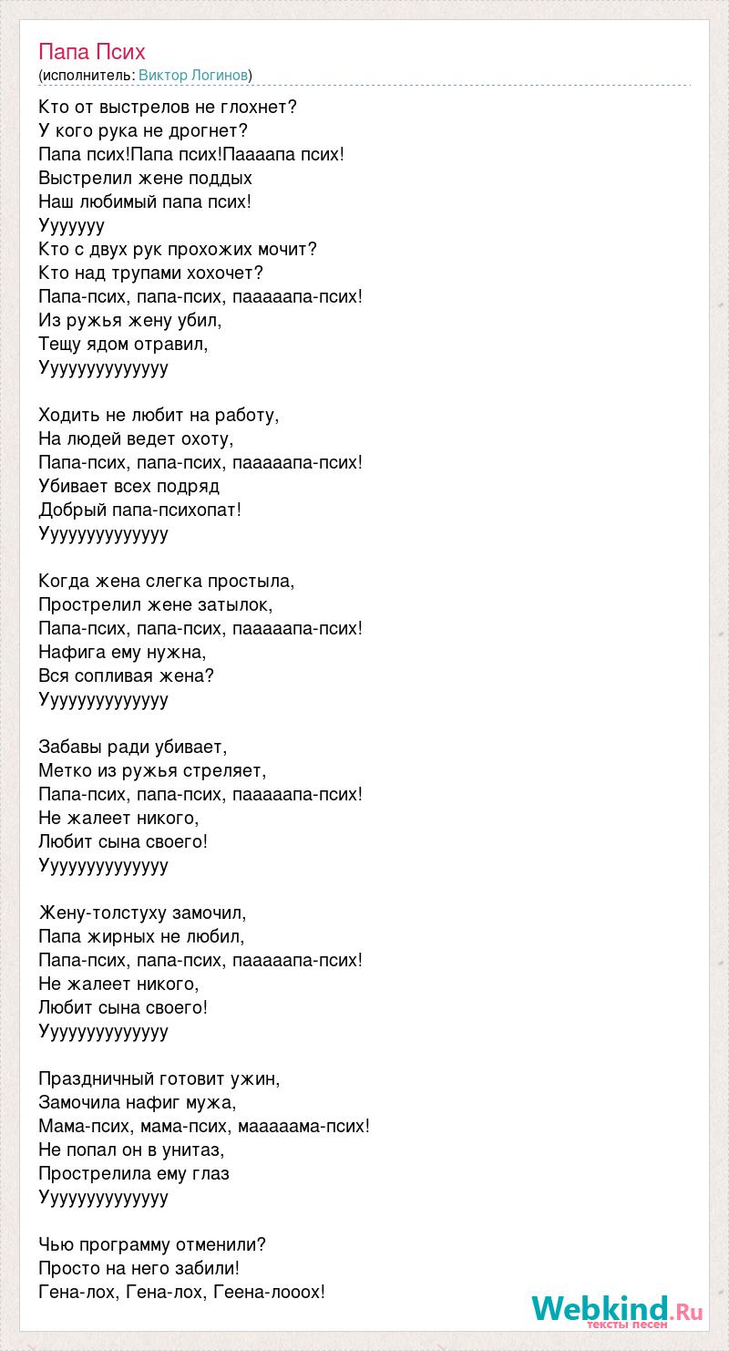 Кто от выстрелов не глохнет? У кого рука не дрогнет? Папа псих!Папа псих!Паааапа псих! Выстрелил жене поддых Наш любимый папа псих! Ууууууу Кто с двух рук прохожих мочит? Кто над трупами хохочет? Папа-псих, папа-псих, пааааапа-псих! Из ружья жену убил, Тещу ядом отравил, Уууууууууууууу Ходить не любит на работу, На людей ведет охоту, Папа-псих, папа-псих, пааааапа-псих! Убивает всех подряд Добрый папа-психопат! Уууууууууууууу Когда жена слегка простыла, Прострелил жене затылок, Папа-псих, папа-псих, пааааапа-псих! Нафига ему нужна, Вся сопливая жена? Уууууууууууууу Забавы ради убивает, Метко из ружья стреляет, Папа-псих, папа-псих, пааааапа-псих! Не жалеет никого, Любит сына своего! Уууууууууууууу Жену-толстуху замочил, Папа жирных не любил, Папа-псих, папа-псих, пааааапа-псих! Не жалеет никого, Любит сына своего! Уууууууууууууу Праздничный готовит ужин, Замочила нафиг мужа, Мама-псих, мама-псих, мааааама-псих! Не попал он в унитаз, Прострелила ему глаз Уууууууууууууу Чью программу отменили? Просто на него забили! Гена-лох, Гена-лох, Геена-лооох!