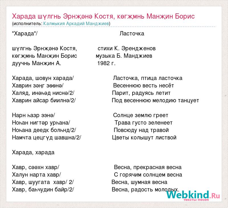 "Харада"/ Ласточка шүлгнь Эрнҗәнә Костя, стихи К. Эрендженов көгҗмнь Манҗин Борис музыка Б. Манджиев дуучнь Манҗин А. 1982 г. Харада, шовун харада/ Ласточка, птица ласточка Хаврин зәңг зѳѳнә/ Весеннюю весть несёт Халяд, инәһәд ниснә/2/ Парит, радуясь летит Хаврин айсар биилнә/2/ Под весеннюю мелодию танцует Нарн һазр ээнә/ Солнце землю греет Ноһан нигтәр урһана/ Трава густо зеленеет Ноһана деедк болһнд/2/ Повсюду над травой Намчта цецгүд шавшна/2/ Цветы колышут листвой Харада, харада Хавр, сәәхн хавр/ Весна, прекрасная весна Халун нарта хавр/ С горячим солнцем весна Хавр, шуугата хавр/ 2/ Весна, шумная весна Хавр, баһчудин байр/2/ Весна, радость молодых.