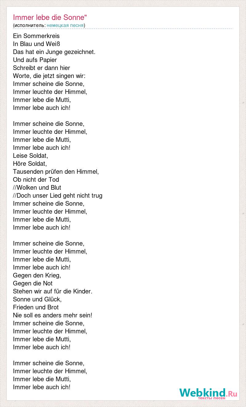 Ein Sommerkreis In Blau und Weiß Das hat ein Junge gezeichnet. Und aufs Papier Schreibt er dann hier Worte, die jetzt singen wir: Immer scheine die Sonne, Immer leuchte der Himmel, Immer lebe die Mutti, Immer lebe auch ich! Immer scheine die Sonne, Immer leuchte der Himmel, Immer lebe die Mutti, Immer lebe auch ich! Leise Soldat, Höre Soldat, Tausenden prüfen den Himmel, Ob nicht der Tod //Wolken und Blut //Doch unser Lied geht nicht trug Immer scheine die Sonne, Immer leuchte der Himmel, Immer lebe die Mutti, Immer lebe auch ich! Immer scheine die Sonne, Immer leuchte der Himmel, Immer lebe die Mutti, Immer lebe auch ich! Gegen den Krieg, Gegen die Not Stehen wir auf für die Kinder. Sonne und Glück, Frieden und Brot Nie soll es anders mehr sein! Immer scheine die Sonne, Immer leuchte der Himmel, Immer lebe die Mutti, Immer lebe auch ich! Immer scheine die Sonne, Immer leuchte der Himmel, Immer lebe die Mutti, Immer lebe auch ich!