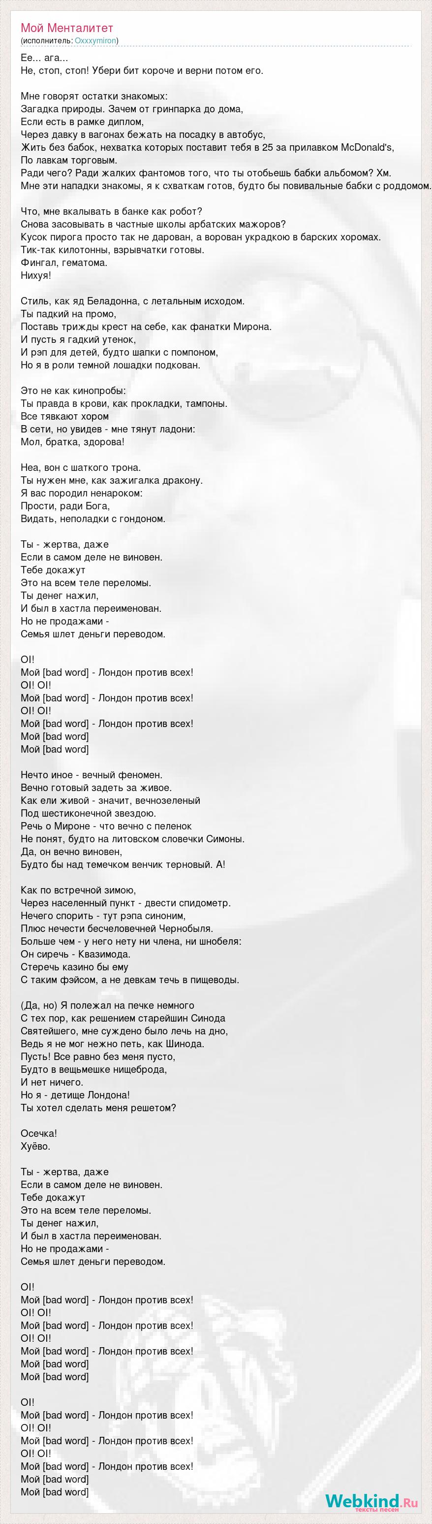 Ее... ага... Не, стоп, стоп! Убери бит короче и верни потом его. Мне говорят остатки знакомых: Загадка природы. Зачем от гринпарка до дома, Если есть в рамке диплом, Через давку в вагонах бежать на посадку в автобус, Жить без бабок, нехватка которых поставит тебя в 25 за прилавком McDonald's, По лавкам торговым. Ради чего? Ради жалких фантомов того, что ты отобьешь бабки альбомом? Хм. Мне эти нападки знакомы, я к схваткам готов, будто бы повивальные бабки с роддомом. Что, мне вкалывать в банке как робот? Снова засовывать в частные школы арбатских мажоров? Кусок пирога просто так не дарован, а ворован украдкою в барских хоромах. Тик-так килотонны, взрывчатки готовы. Фингал, гематома. Нихуя! Стиль, как яд Беладонна, с летальным исходом. Ты падкий на промо, Поставь трижды крест на себе, как фанатки Мирона. И пусть я гадкий утенок, И рэп для детей, будто шапки с помпоном, Но я в роли темной лошадки подкован. Это не как кинопробы: Ты правда в крови, как прокладки, тампоны. Все тявкают хором В сети, но увидев - мне тянут ладони: Мол, братка, здорова! Неа, вон с шаткого трона. Ты нужен мне, как зажигалка дракону. Я вас породил ненароком: Прости, ради Бога, Видать, неполадки с гондоном. Ты - жертва, даже Если в самом деле не виновен. Тебе докажут Это на всем теле переломы. Ты денег нажил, И был в хастла переименован. Но не продажами - Семья шлет деньги переводом. OI! Мой [bad word] - Лондон против всех! OI! OI! Мой [bad word] - Лондон против всех! OI! OI! Мой [bad word] - Лондон против всех! Мой [bad word] Мой [bad word] Нечто иное - вечный феномен. Вечно готовый задеть за живое. Как ели живой - значит, вечнозеленый Под шестиконечной звездою. Речь о Мироне - что вечно с пеленок Не понят, будто на литовском словечки Симоны. Да, он вечно виновен, Будто бы над темечком венчик терновый. А! Как по встречной зимою, Через населенный пункт - двести спидометр. Нечего спорить - тут рэпа синоним, Плюс нечести бесчеловечней Чернобыля. Больше чем - у него нету ни члена, ни шнобеля: Он сиречь - Квазимода. Стеречь казино бы ему С таким фэйсом, а не девкам течь в пищеводы. (Да, но) Я полежал на печке немного С тех пор, как решением старейшин Синода Святейшего, мне суждено было лечь на дно, Ведь я не мог нежно петь, как Шинода. Пусть! Все равно без меня пусто, Будто в вещьмешке нищеброда, И нет ничего. Но я - детище Лондона! Ты хотел сделать меня решетом? Осечка! Хуёво. Ты - жертва, даже Если в самом деле не виновен. Тебе докажут Это на всем теле переломы. Ты денег нажил, И был в хастла переименован. Но не продажами - Семья шлет деньги переводом. OI! Мой [bad word] - Лондон против всех! OI! OI! Мой [bad word] - Лондон против всех! OI! OI! Мой [bad word] - Лондон против всех! Мой [bad word] Мой [bad word] OI! Мой [bad word] - Лондон против всех! OI! OI! Мой [bad word] - Лондон против всех! OI! OI! Мой [bad word] - Лондон против всех! Мой [bad word] Мой [bad word]