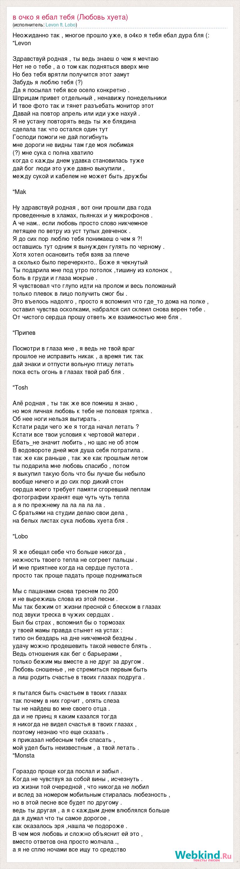 Неожиданно так , многое прошло уже, в о4ко я тебя ебал дура бля (: "Levon Здравствуй родная , ты ведь знаеш о чем я мечтаю Нет не о тебе , а о том как подняться вверх мне Но без тебя врятли получится этот замут Забудь я люблю тебя (?) Да я посылал тебя все осело конкретно . Шприцам привет отдельный , ненавижу понедельники И твое фото так и тянет разъебать монитор этот Давай на повтор апрель или иди уже нахуй . Я не устану повторять ведь ты же блядина сделала так что остался один тут Господи помоги не дай погибнуть мне дороги не видны там где моя любимая (?) мне сука с полна хватило когда с кажды днем удавка становилась туже дай бог люди это уже давно выкупили , между сукой и кабелем не может быть дружбы "Mak Ну здравствуй родная , вот они прошли два года проведенные в хламах, пьянках и у микрофонов . А че нам.. если любовь просто слово никчемное летящее по ветру из уст тупых девченок . Я до сих пор люблю тебя понимаеш о чем я ?! оставшись тут одним я вынужден гулять по черному . Хотя хотел осановить тебя взяв за плече а сколько было перечеркнто.. Боже я чекнутый Ты подарила мне под утро потолок ,тишину из колонок , боль в груди и глаза мокрые . Я чувствовал что глупо идти на пролом и весь поломаный только плевок в лицо получить смог бы . Это въелось надолго , просто я вспомнил что где_то дома на полке , оставил чувства осколками, набрался сил склеил снова верен тебе . От чистого сердца прошу ответь же взаимностью мне бля . "Припев Посмотри в глаза мне , я ведь не твой враг прошлое не исправить никак , а время тик так дай знаки и отпусти вольную птицу летать пока есть огонь в глазах твой раб бля . "Tosh Алё родная , ты так же все помниш я знаю , но моя личная любовь к тебе не половая тряпка . Об нее ноги нельзя вытирать . Кстати ради чего же я тогда начал летать ? Кстати все твои условия к чертовой матери . Ебать_не значит любить , но щас не об этом В водовороте дней моя душа себя потратила . так же как раньше , так же как прошлым летом ты подарила мне любовь спасибо , потом я выкупил такую боль что бы лучше бы небыло вообще ничего и до сих пор дикий стон сердца моего требует памяти сгоревший пеплам фотографии хранят еще чуть чуть тепла а я по прежнему ла ла ла ла ла . С братьями на студии делаю свои дела , на белых листах сука любовь хуета бля . "Lobo Я же обещал себе что больше никогда , нежность твоего тепла не согреет пальцы . И мне приятнее когда на сердце пустота . просто так проще падать проще подниматься Мы с пацанами снова треснем по 200 и не вырежишь слова из этой песни . Мы так бежим от жизни пресной с блеском в глазах под звуки треска в чужих сердцах . Был бы страх , вспомнил бы о тормозах у твоей мамы правда стынет на устах : типо он бездарь на дне никчемной бездны . удачу можно продешевить такой невесте блять . Ведь отношения как бег с барьерами , только бежим мы вместе а не друг за другом . Любовь сношенье , не стремиться первым быть а лиш родить счастье в твоих глазах подруга . я пытался быть счастьем в твоих глазах так почему в них горчит , опять слеза ты не найдеш во мне своего отца . да и не принц я каким казался тогда я никогда не видел счастья в твоих глазах , поэтому незнаю что еще сказать . я приказал небесным тебя спасать , мой удел быть неизвестным , а твой летать . "Monsta Гораздо проще когда послал и забыл . Когда не чувствуя за собой вины , исчезнуть . из жизни той очередной , что никогда не лю