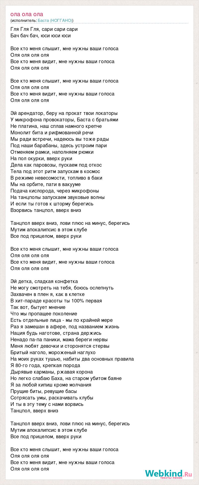 Гля Гля Гля, сари сари сари Бач бач бач, юси юси юси Все кто меня слышит, мне нужны ваши голоса Оля оля оля оля Все кто меня видит, мне нужны ваши голоса Оля оля оля оля Все кто меня слышит, мне нужны ваши голоса Оля оля оля оля Все кто меня видит, мне нужны ваши голоса Оля оля оля оля Эй арендатор, беру на прокат твои локаторы У микрофона провокаторы, Баста с братьями Не платина, наш сплав намного крепче Монолит бита и рифмованной речи Мы ради встречи, надеюсь вы тоже рады Под наши барабаны, здесь устроим пари Отменяем рамки, наполняем рюмки На пол окурки, вверх руки Дела как паровозы, пускаем под откос Тела под этот ритм запускам в космос В режиме невесомости, топливо в баки Мы на орбите, пати в вакууме Подача кислорода, через микрофоны На танцполы запускаем звуковые волны И если ты готов к шторму берегись Взорвись танцпол, вверх вниз Танцпол вверх вниз, лови плюс на минус, берегись Мутим апокалипсис в этом клубе Все под прицелом, вверх руки Все кто меня слышит, мне нужны ваши голоса Оля оля оля оля Все кто меня видит, мне нужны ваши голоса Оля оля оля оля Эй детка, сладкая конфетка Не могу смотреть на тебя, боюсь ослепнуть Захвачен в плен я, как в клетке В хит-параде красоты ты 100% первая Так вот, бытует мнение Что мы пропащее поколение Есть отдельные лица - мы по крайней мере Раз я замешан в афере, под названием жизнь Нация будь наготове, страна держись Ненадо па-па паники, мама береги нервы Меня любят девочки и сторонятся стервы Бритый наголо, мороженый наглухо На моих руках тушью, набиты два основных правила Я 80-го года, крепкая порода Дырявые карманы, ржавая корона Но легко слабаю Баха, на старом убитом баяне Я за любой кипиш кроме молчания Прущие биты, ревущие басы Сотрясать умы, раскачивать клубы И ты в эту тему с нами ворвись Танцпол, вверх вниз Танцпол вверх вниз, лови плюс на минус, берегись Мутим апокалипсис в этом клубе Все под прицелом, вверх руки Все кто меня слышит, мне нужны ваши голоса Оля оля оля оля Все кто меня видит, мне нужны ваши голоса Оля оля оля оля