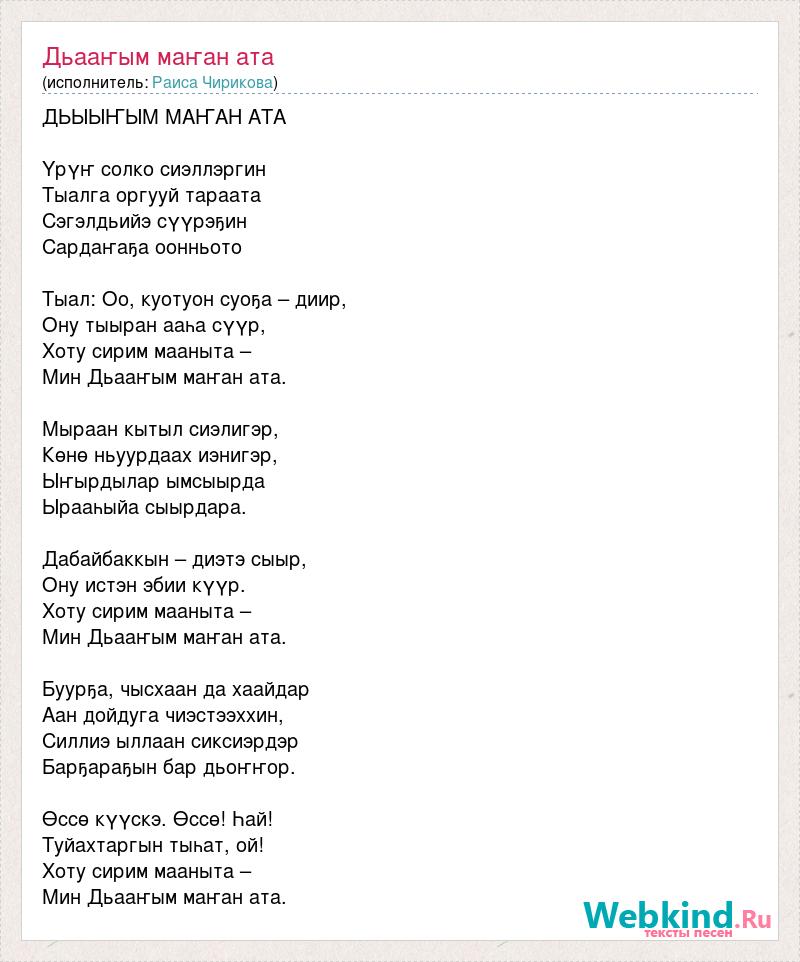 ДЬЫЫҤЫМ МАҤАН АТА Үрүҥ солко сиэллэргин Тыалга оргууй тараата Сэгэлдьийэ сүүрэҕин Сардаҥаҕа оонньото Тыал: Оо, куотуон суоҕа – диир, Ону тыыран ааһа сүүр, Хоту сирим мааныта – Мин Дьааҥым маҥан ата. Мыраан кытыл сиэлигэр, Көнө ньуурдаах иэнигэр, Ыҥырдылар ымсыырда Ырааһыйа сыырдара. Дабайбаккын – диэтэ сыыр, Ону истэн эбии күүр. Хоту сирим мааныта – Мин Дьааҥым маҥан ата. Буурҕа, чысхаан да хаайдар Аан дойдуга чиэстээххин, Силлиэ ыллаан сиксиэрдэр Барҕараҕын бар дьоҥҥор. Өссө күүскэ. Өссө! Һай! Туйахтаргын тыһат, ой! Хоту сирим мааныта – Мин Дьааҥым маҥан ата.