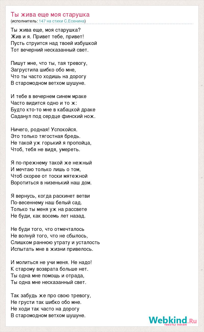 Ты жива еще, моя старушка? Жив и я. Привет тебе, привет! Пусть струится над твоей избушкой Тот вечерний несказанный свет. Пишут мне, что ты, тая тревогу, Загрустила шибко обо мне, Что ты часто ходишь на дорогу В старомодном ветхом шушуне. И тебе в вечернем синем мраке Часто видится одно и то ж: Будто кто-то мне в кабацкой драке Саданул под сердце финский нож. Ничего, родная! Успокойся. Это только тягостная бредь. Не такой уж горький я пропойца, Чтоб, тебя не видя, умереть. Я по-прежнему такой же нежный И мечтаю только лишь о том, Чтоб скорее от тоски мятежной Воротиться в низенький наш дом. Я вернусь, когда раскинет ветви По-весеннему наш белый сад. Только ты меня уж на рассвете Не буди, как восемь лет назад. Не буди того, что отмечталось Не волнуй того, что не сбылось, Слишком раннюю утрату и усталость Испытать мне в жизни привелось. И молиться не учи меня. Не надо! К старому возврата больше нет. Ты одна мне помощь и отрада, Ты одна мне несказанный свет. Так забудь же про свою тревогу, Не грусти так шибко обо мне. Не ходи так часто на дорогу В старомодном ветхом шушуне.