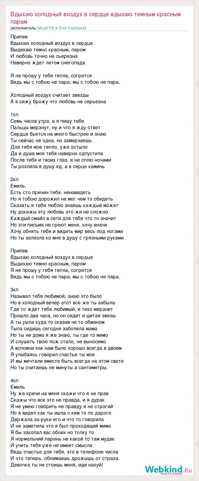 Припев Вдыхаю холодный воздух в сердце Выдихаю темно красным, паром И любовь точно не сьерезна Наверно ждет летом снегопада Я не прошу у тебя тепла, согрется Ведь мы с тобою не пара, мы с тобою не пара. Холодный воздух считает звезды А я сижу брожу что любовь не серьезна 1кп Семь часов утра, а я пишу тебе Пальцы мерзнут, ну и что я жду ответ Сердце бьется на много быстрее и знаю Ты сейчас не одна, но замерзаешь Для тебя мое тепло, уже остыло Да и душа моя тебя наверно одпустила После тебя и твоих глаз, я не сплю ночами Ты розлила в душу яд, а в серце каминь 2кп Емиль. Есть сто причин тебя, ненавидеть Но я тобою дорожил не мог чем то обидеть Сказать я тебя люблю знаешь каждый может Ну докажы эту любовь это жи не сложно Каждый смайл в сети для тебя что то значит Но эти письма не греют меня, хочу иначе Хочу обнять тебя и видить мир весь под ногами Но ты залезла ко мне в душу с грязными руками Припев Вдыхаю холодный воздух в сердце Выдихаю темно красным, паром Я не прошу у тебя тепла, согрется Ведь мы с тобою не пара, мы с тобою не пара. 3кп Называл тебя любимой, знаю это было Но в холодный вечер этот все же ты забыла Где то ждет тебя любимый, и тихо мерзнит Прошло два часа, но он сидит и щитая звезы А ты ушла куда то сказав че то обманом Тыпа сидишь сегодня заболела мама Но ты не дома я же знаю, ты где то мимо И слушать твою лож стало, не выносимо А вспомни как нам было хорошо всегда в двоем Я улыбаясь говорил счастье ты мое И мы мечтали вместе быть всегда на этом свете Но ты считаешь не минуты а сантиметры. 4кп Емиль Ну же кричи на меня скажи что я не прав Скажы что все это не правда, и я дурак Я не умею говорить не правду я не строгий Но я видел как ты ишла с кем то по дороге Держала за руки его и что то говорила И не заметила что я был проходящий мимо Я бы закопал вас обоих но толку то Я нормальний парень не какой то там мудак И учить тебя уже не имеет смысла Ведь счастье для тебя, это в телефоне числа И что теперь, обнимаешь дрожышь от страха. Девочка ты не стоишь меня, иди нахуй!