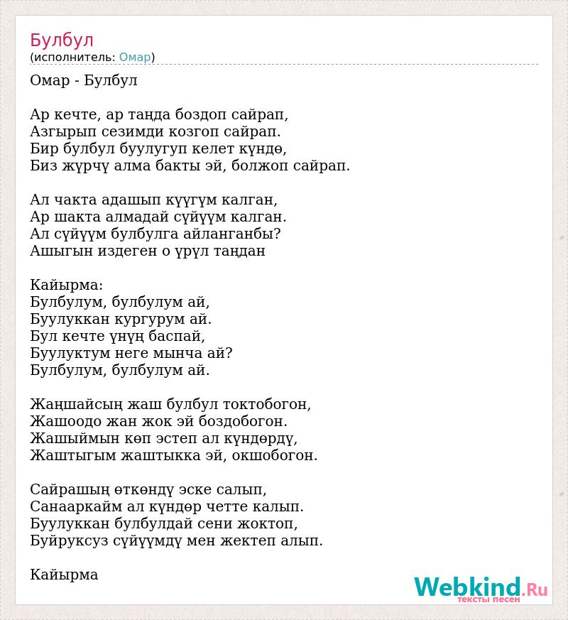 Омар - Булбул Ар кечте, ар таңда боздоп сайрап, Азгырып сезимди козгоп сайрап. Бир булбул буулугуп келет күндө, Биз жүрчү алма бакты эй, болжоп сайрап. Ал чакта адашып күүгүм калган, Ар шакта алмадай сүйүүм калган. Ал сүйүүм булбулга айланганбы? Ашыгын издеген о үрүл таңдан Кайырма: Булбулум, булбулум ай, Буулуккан кургурум ай. Бул кечте үнүң баспай, Буулуктум неге мынча ай? Булбулум, булбулум ай. Жаңшайсың жаш булбул токтобогон, Жашоодо жан жок эй боздобогон. Жашыймын көп эстеп ал күндөрдү, Жаштыгым жаштыкка эй, окшобогон. Сайрашың өткөндү эске салып, Санааркайм ал күндөр четте калып. Буулуккан булбулдай сени жоктоп, Буйруксуз сүйүүмдү мен жектеп алып. Кайырма