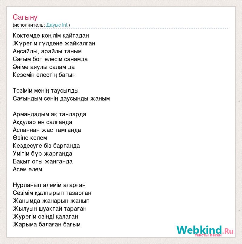 Көктемде көңілім қайтадан Жүрегім гүлдене жайқалган Аңсайды, арайлы таным Сағым боп елесім санамда Әніме аяулы салам да Кеземін елестің бағын Тозімім менің таусылды Сағындым сенің даусынды жаным Армандадым ақ тандарда Аққулар ән салғанда Аспаннан жас тамғанда Өзіне келем Кездесуге біз барғанда Умітім бүр жарғанда Бақыт оты жанганда Асем әлем Нурланып алемім ағарған Сезімім құлпырып тазарған Жанымда жанарын жанып Жылуын шуактай тараған Журегім өзінді қалаган Жарыма балаған бағым