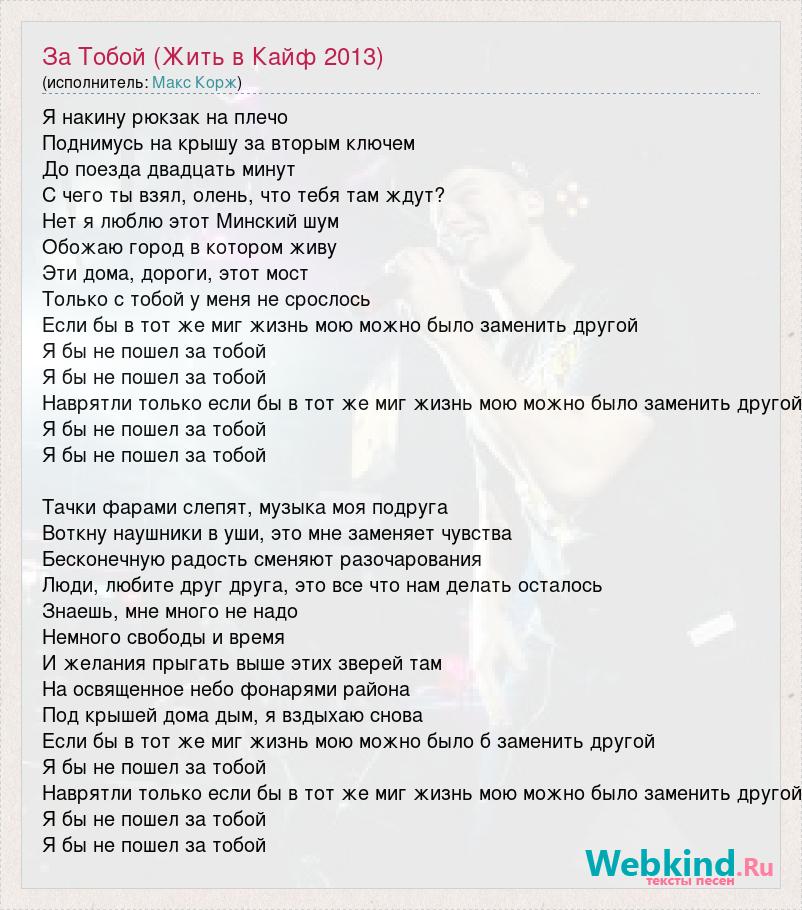 Я накину рюкзак на плечо Поднимусь на крышу за вторым ключем До поезда двадцать минут С чего ты взял, олень, что тебя там ждут? Нет я люблю этот Минский шум Обожаю город в котором живу Эти дома, дороги, этот мост Только с тобой у меня не срослось Если бы в тот же миг жизнь мою можно было заменить другой Я бы не пошел за тобой Я бы не пошел за тобой Наврятли только если бы в тот же миг жизнь мою можно было заменить другой Я бы не пошел за тобой Я бы не пошел за тобой Тачки фарами слепят, музыка моя подруга Воткну наушники в уши, это мне заменяет чувства Бесконечную радость сменяют разочарования Люди, любите друг друга, это все что нам делать осталось Знаешь, мне много не надо Немного свободы и время И желания прыгать выше этих зверей там На освященное небо фонарями района Под крышей дома дым, я вздыхаю снова Если бы в тот же миг жизнь мою можно было б заменить другой Я бы не пошел за тобой Наврятли только если бы в тот же миг жизнь мою можно было заменить другой Я бы не пошел за тобой Я бы не пошел за тобой