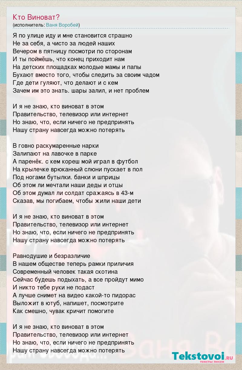 Я по улице иду и мне становится страшно Не за себя, а чисто за людей наших Вечером в пятницу посмотри по сторонам И ты поймёшь, что конец приходит нам На детских площадках молодые мамы и папы Бухают вместо того, чтобы следить за своим чадом Где дети гуляют, что делают и с кем Зачем им это знать. шары залил, и нет проблем И я не знаю, кто виноват в этом Правительство, телевизор или интернет Но знаю, что, если ничего не предпринять Нашу страну навсегда можно потерять В говно раскумаренные нарки Залипают на лавочке в парке А паренёк. с кем кореш мой играл в футбол На крылечке врюканный слюни пускает в пол Под ногами бутылки. банки и шприцы Об этом ли мечтали наши деды и отцы Об этом думал ли солдат сражаясь в 43-м Сказав, мы погибаем, чтобы жили наши дети И я не знаю, кто виноват в этом Правительство, телевизор или интернет Но знаю, что, если ничего не предпринять Нашу страну навсегда можно потерять Равнодушие и безразличие В нашем обществе теперь рамки приличия Современный человек такая скотина Сейчас будешь подыхать, а все пройдут мимо И никто тебе руки не подаст А лучше снимет на видео какой-то пидорас Выложит в ютуб, напишет, посмотрите Как смешно, чувак кричит помогите И я не знаю, кто виноват в этом Правительство, телевизор или интернет Но знаю, что, если ничего не предпринять Нашу страну навсегда можно потерять