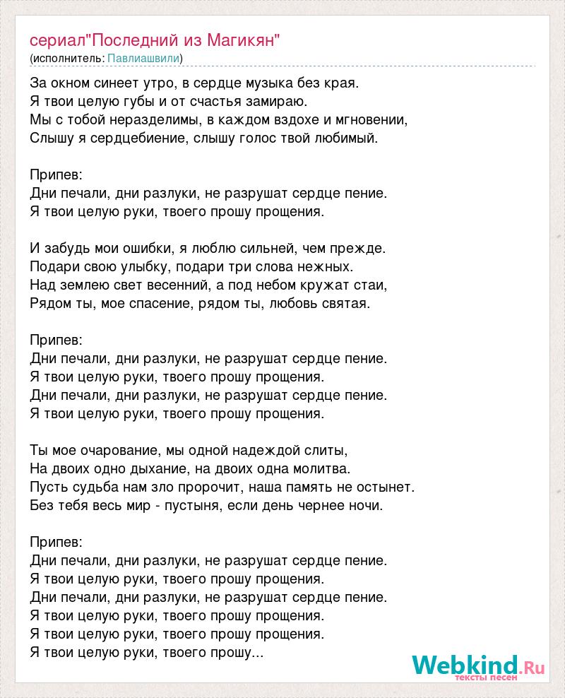 За окном синеет утро, в сердце музыка без края. Я твои целую губы и от счастья замираю. Мы с тобой неразделимы, в каждом вздохе и мгновении, Слышу я сердцебиение, слышу голос твой любимый. Припев: Дни печали, дни разлуки, не разрушат сердце пение. Я твои целую руки, твоего прошу прощения. И забудь мои ошибки, я люблю сильней, чем прежде. Подари свою улыбку, подари три слова нежных. Над землею свет весенний, а под небом кружат стаи, Рядом ты, мое спасение, рядом ты, любовь святая. Припев: Дни печали, дни разлуки, не разрушат сердце пение. Я твои целую руки, твоего прошу прощения. Дни печали, дни разлуки, не разрушат сердце пение. Я твои целую руки, твоего прошу прощения. Ты мое очарование, мы одной надеждой слиты, На двоих одно дыхание, на двоих одна молитва. Пусть судьба нам зло пророчит, наша память не остынет. Без тебя весь мир - пустыня, если день чернее ночи. Припев: Дни печали, дни разлуки, не разрушат сердце пение. Я твои целую руки, твоего прошу прощения. Дни печали, дни разлуки, не разрушат сердце пение. Я твои целую руки, твоего прошу прощения. Я твои целую руки, твоего прошу прощения. Я твои целую руки, твоего прошу...