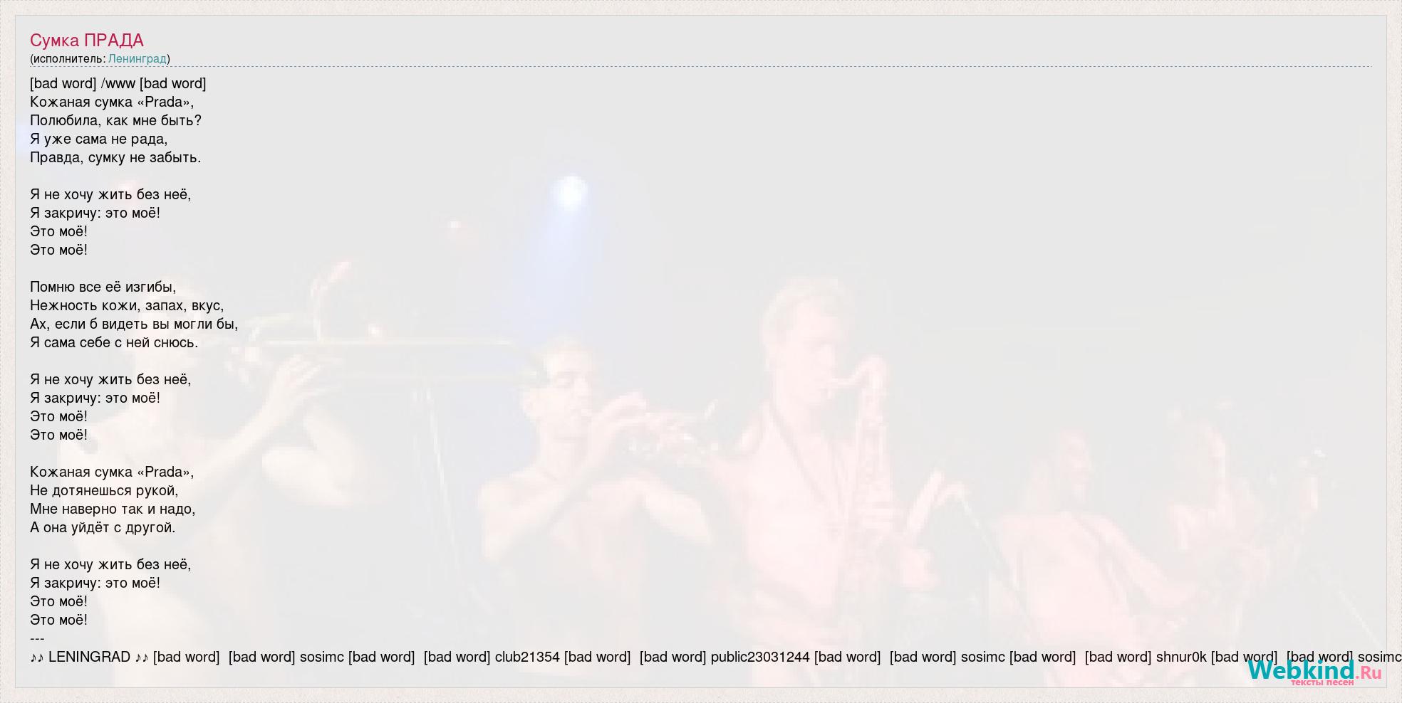 [bad word] /www [bad word] Кожаная сумка «Prada», Полюбила, как мне быть? Я уже сама не рада, Правда, сумку не забыть. Я не хочу жить без неё, Я закричу: это моё! Это моё! Это моё! Помню все её изгибы, Нежность кожи, запах, вкус, Ах, если б видеть вы могли бы, Я сама себе с ней снюсь. Я не хочу жить без неё, Я закричу: это моё! Это моё! Это моё! Кожаная сумка «Prada», Не дотянешься рукой, Мне наверно так и надо, А она уйдёт с другой. Я не хочу жить без неё, Я закричу: это моё! Это моё! Это моё! --- ♪♪ LENINGRAD ♪♪ [bad word] [bad word] sosimc [bad word] [bad word] club21354 [bad word] [bad word] public23031244 [bad word] [bad word] sosimc [bad word] [bad word] shnur0k [bad word] [bad word] sosimc