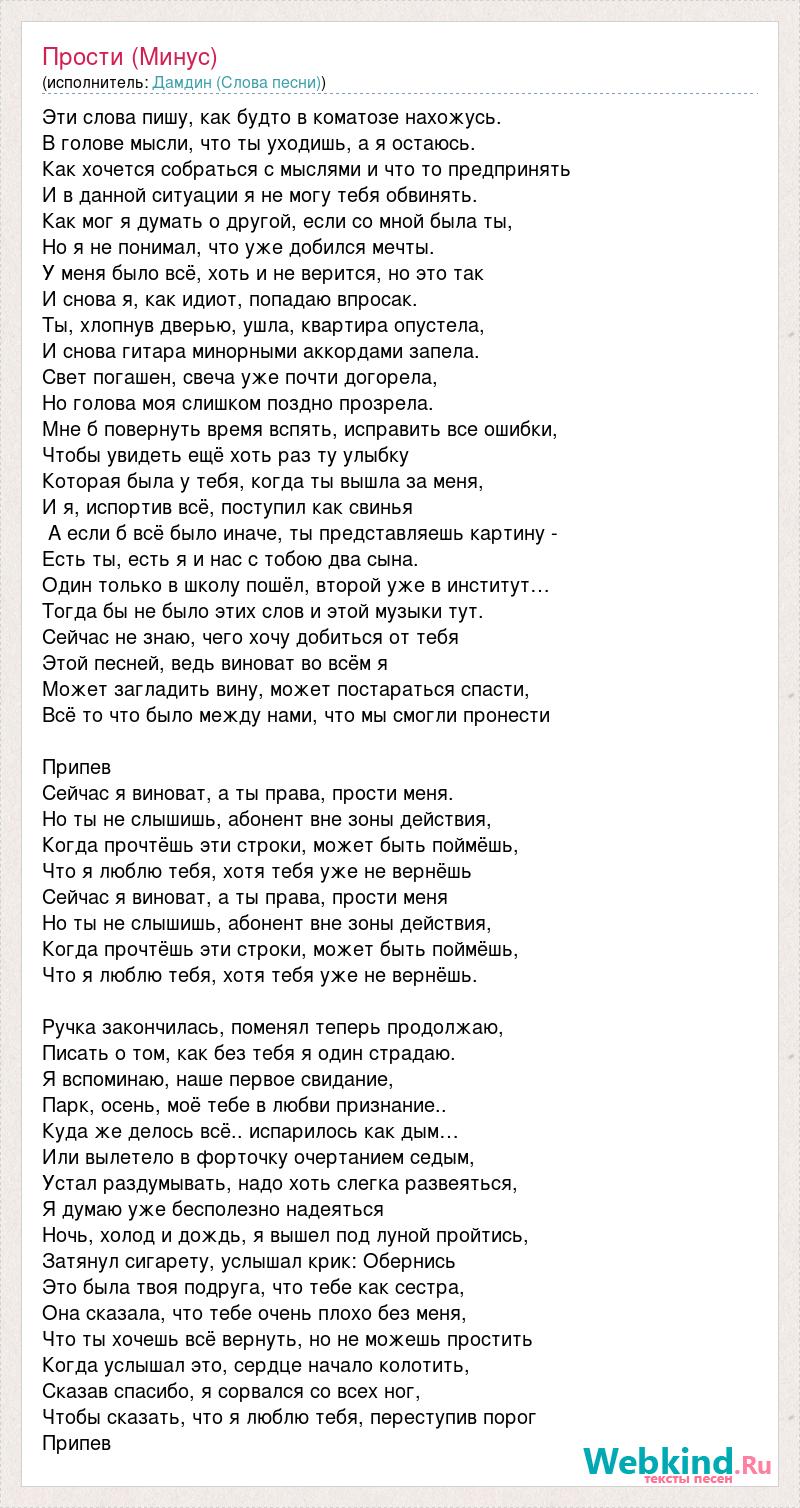 Эти слова пишу, как будто в коматозе нахожусь. В голове мысли, что ты уходишь, а я остаюсь. Как хочется собраться с мыслями и что то предпринять И в данной ситуации я не могу тебя обвинять. Как мог я думать о другой, если со мной была ты, Но я не понимал, что уже добился мечты. У меня было всё, хоть и не верится, но это так И снова я, как идиот, попадаю впросак. Ты, хлопнув дверью, ушла, квартира опустела, И снова гитара минорными аккордами запела. Свет погашен, свеча уже почти догорела, Но голова моя слишком поздно прозрела. Мне б повернуть время вспять, исправить все ошибки, Чтобы увидеть ещё хоть раз ту улыбку Которая была у тебя, когда ты вышла за меня, И я, испортив всё, поступил как свинья А если б всё было иначе, ты представляешь картину - Есть ты, есть я и нас с тобою два сына. Один только в школу пошёл, второй уже в институт… Тогда бы не было этих слов и этой музыки тут. Сейчас не знаю, чего хочу добиться от тебя Этой песней, ведь виноват во всём я Может загладить вину, может постараться спасти, Всё то что было между нами, что мы смогли пронести Припев Сейчас я виноват, а ты права, прости меня. Но ты не слышишь, абонент вне зоны действия, Когда прочтёшь эти строки, может быть поймёшь, Что я люблю тебя, хотя тебя уже не вернёшь Сейчас я виноват, а ты права, прости меня Но ты не слышишь, абонент вне зоны действия, Когда прочтёшь эти строки, может быть поймёшь, Что я люблю тебя, хотя тебя уже не вернёшь. Ручка закончилась, поменял теперь продолжаю, Писать о том, как без тебя я один страдаю. Я вспоминаю, наше первое свидание, Парк, осень, моё тебе в любви признание.. Куда же делось всё.. испарилось как дым… Или вылетело в форточку очертанием седым, Устал раздумывать, надо хоть слегка развеяться, Я думаю уже бесполезно надеяться Ночь, холод и дождь, я вышел под луной пройтись, Затянул сигарету, услышал крик: Обернись Это была твоя подруга, что тебе как сестра, Она сказала, что тебе очень плохо без меня, Что ты хочешь всё вернуть, но не можешь простить Когда услышал это, сердце начало колотить, Сказав спасибо, я сорвался со всех ног, Чтобы сказать, что я люблю тебя, переступив порог Припев