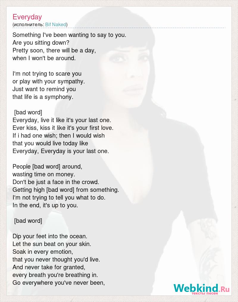 Something I've been wanting to say to you. Are you sitting down? Pretty soon, there will be a day, when I won't be around. I'm not trying to scare you or play with your sympathy. Just want to remind you that life is a symphony. [bad word] Everyday, live it like it's your last one. Ever kiss, kiss it like it's your first love. If i had one wish; then I would wish that you would live today like Everyday, Everyday is your last one. People [bad word] around, wasting time on money. Don't be just a face in the crowd. Getting high [bad word] from something. I'm not trying to tell you what to do. In the end, it's up to you. [bad word] Dip your feet into the ocean. Let the sun beat on your skin. Soak in every emotion, that you never thought you'd live. And never take for granted, every breath you're breathing in. Go everywhere you've never been,