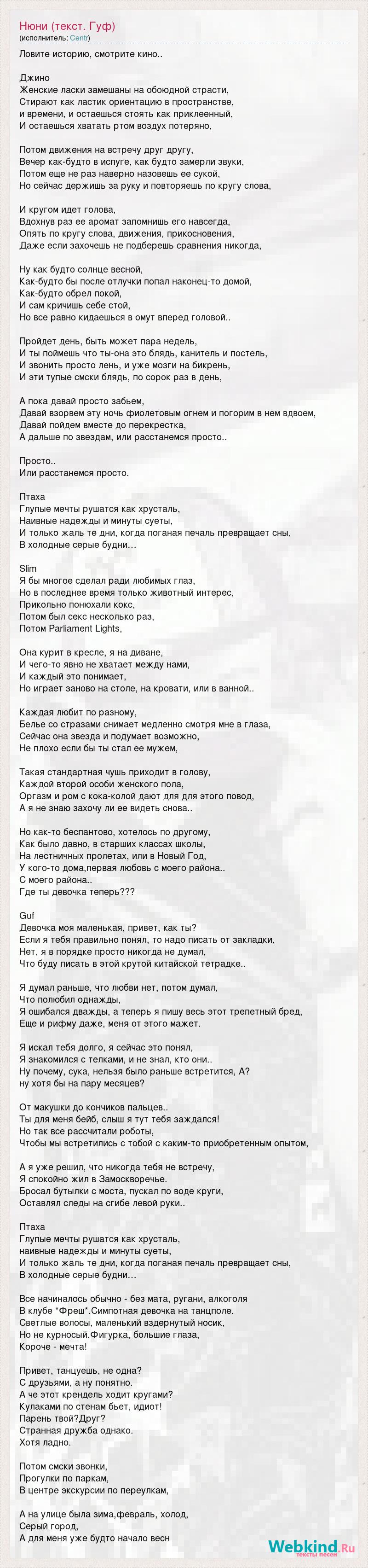 Ловите историю, смотрите кино.. Джино Женские ласки замешаны на обоюдной страсти, Стирают как ластик ориентацию в пространстве, и времени, и остаешься стоять как приклеенный, И остаешься хватать ртом воздух потеряно, Потом движения на встречу друг другу, Вечер как-будто в испуге, как будто замерли звуки, Потом еще не раз наверно назовешь ее сукой, Но сейчас держишь за руку и повторяешь по кругу слова, И кругом идет голова, Вдохнув раз ее аромат запомнишь его навсегда, Опять по кругу слова, движения, прикосновения, Даже если захочешь не подберешь сравнения никогда, Ну как будто солнце весной, Как-будто бы после отлучки попал наконец-то домой, Как-будто обрел покой, И сам кричишь себе стой, Но все равно кидаешься в омут вперед головой.. Пройдет день, быть может пара недель, И ты поймешь что ты-она это блядь, канитель и постель, И звонить просто лень, и уже мозги на бикрень, И эти тупые смски блядь, по сорок раз в день, А пока давай просто забьем, Давай взорвем эту ночь фиолетовым огнем и погорим в нем вдвоем, Давай пойдем вместе до перекрестка, А дальше по звездам, или расстанемся просто.. Просто.. Или расстанемся просто. Птаха Глупые мечты рушатся как хрусталь, Наивные надежды и минуты суеты, И только жаль те дни, когда поганая печаль превращает сны, В холодные серые будни… Slim Я бы многое сделал ради любимых глаз, Но в последнее время только животный интерес, Прикольно понюхали кокс, Потом был секс несколько раз, Потом Parliament Lights, Она курит в кресле, я на диване, И чего-то явно не хватает между нами, И каждый это понимает, Но играет заново на столе, на кровати, или в ванной.. Каждая любит по разному, Белье со стразами снимает медленно смотря мне в глаза, Сейчас она звезда и подумает возможно, Не плохо если бы ты стал ее мужем, Такая стандартная чушь приходит в голову, Каждой второй особи женского пола, Оргазм и ром с кока-колой дают для для этого повод, А я не знаю захочу ли ее видеть снова.. Но как-то беспантово, хотелось по другому, Как было давно, в старших классах школы, На лестничных пролетах, или в Новый Год, У кого-то дома,первая любовь с моего района.. С моего района.. Где ты девочка теперь??? Guf Девочка моя маленькая, привет, как ты? Если я тебя правильно понял, то надо писать от закладки, Нет, я в порядке просто никогда не думал, Что буду писать в этой крутой китайской тетрадке.. Я думал раньше, что любви нет, потом думал, Что полюбил однажды, Я ошибался дважды, а теперь я пишу весь этот трепетный бред, Еще и рифму даже, меня от этого мажет. Я искал тебя долго, я сейчас это понял, Я знакомился с телками, и не знал, кто они.. Ну почему, сука, нельзя было раньше встретится, А? ну хотя бы на пару месяцев? От макушки до кончиков пальцев.. Ты для меня бейб, слыш я тут тебя заждался! Но так все рассчитали роботы, Чтобы мы встретились с тобой с каким-то приобретенным опытом, А я уже решил, что никогда тебя не встречу, Я спокойно жил в Замоскворечье. Бросал бутылки с моста, пускал по воде круги, Оставлял следы на сгибе левой руки.. Птаха Глупые мечты рушатся как хрусталь, наивные надежды и минуты суеты, И только жаль те дни, когда поганая печаль превращает сны, В холодные серые будни… Все начиналось обычно - без мата, ругани, алкоголя В клубе *Фреш*.Симпотная девочка на танцполе. Светлые волосы, маленький вздернутый носик, Но не курносый.Фигурка, большие глаза, Короче - мечта! Привет, танцуе