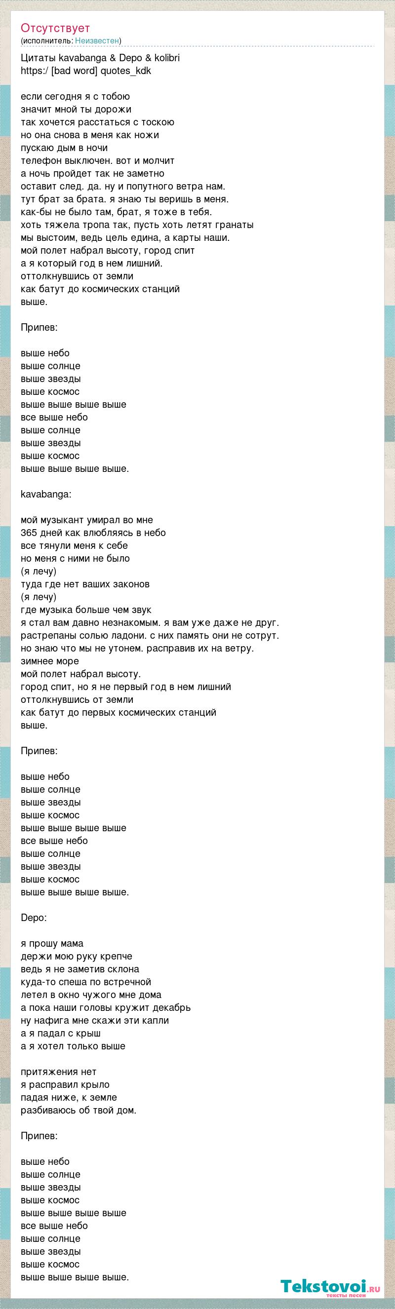 Цитаты kavabanga & Depo & kolibri https:/ [bad word] quotes_kdk если сегодня я с тобою значит мной ты дорожи так хочется расстаться с тоскою но она снова в меня как ножи пускаю дым в ночи телефон выключен. вот и молчит а ночь пройдет так не заметно оставит след. да. ну и попутного ветра нам. тут брат за брата. я знаю ты веришь в меня. как-бы не было там, брат, я тоже в тебя. хоть тяжела тропа так, пусть хоть летят гранаты мы выстоим, ведь цель едина, а карты наши. мой полет набрал высоту, город спит а я который год в нем лишний. оттолкнувшись от земли как батут до космических станций выше. Припев: выше небо выше солнце выше звезды выше космос выше выше выше выше все выше небо выше солнце выше звезды выше космос выше выше выше выше. kavabanga: мой музыкант умирал во мне 365 дней как влюбляясь в небо все тянули меня к себе но меня с ними не было (я лечу) туда где нет ваших законов (я лечу) где музыка больше чем звук я стал вам давно незнакомым. я вам уже даже не друг. растрепаны солью ладони. с них память они не сотрут. но знаю что мы не утонем. расправив их на ветру. зимнее море мой полет набрал высоту. город спит, но я не первый год в нем лишний оттолкнувшись от земли как батут до первых космических станций выше. Припев: выше небо выше солнце выше звезды выше космос выше выше выше выше все выше небо выше солнце выше звезды выше космос выше выше выше выше. Depo: я прошу мама держи мою руку крепче ведь я не заметив склона куда-то спеша по встречной летел в окно чужого мне дома а пока наши головы кружит декабрь ну нафига мне скажи эти капли а я падал с крыш а я хотел только выше притяжения нет я расправил крыло падая ниже, к земле разбиваюсь об твой дом. Припев: выше небо выше солнце выше звезды выше космос выше выше выше выше все выше небо выше солнце выше звезды выше космос выше выше выше выше.